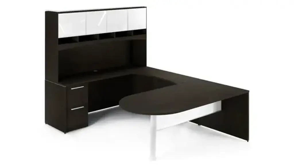 This Desk is Reversible The Potenza Series propose a unique versatile design. Our low glared thermofused laminate offers a rich wood look & feel. The matching 3mm PVC edge offers comfort & protection. U desk includes a two drawer file/file pedestal. Hutch with glass doors features a floated glass top. Bullet end desk with modesty panel measures 72" x 36" x 29"H. Curved bridge measures 42"W x 20"D x 29"H. Credenza measures 72"W x 24"D x 29"H. Overall dimensions are 72"W x 102"D x 72"H. Unit is reversible - left return is shown. Ships ready for easy assembly - pedestal ships assembled.