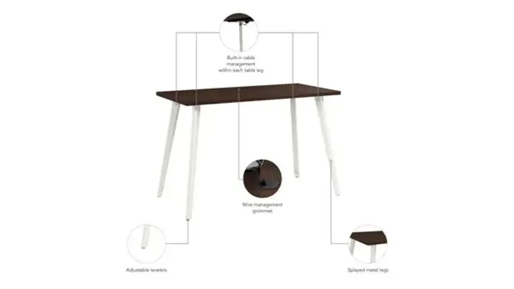 The Bush Business Furniture Vista 48" W x 24" D Computer Desk with Splayed Metal Legs offers a practical, long-lasting workspace ideal for open area offices. Its durable 1-inch thick thermally fused laminate surface resists scratches, stains, and other cosmetic damage while supporting up to 200 pounds. Splayed metal legs provide a sleek look with built-in cable management, keeping cords routed to the floor for a clutter-free space. Designed for maximum stability, the desk includes adjustable levelers to compensate for uneven flooring and an optional wall anchor for added security. A built-in wire management grommet helps keep cords and cables organized. Available in several contemporary finishes, and you can complete your office with a coordinating Vista Cabinet or Bookcase (sold separately). Bush Business Furniture's commitment to safety includes rigorous testing that meets or exceeds ANSI/BIFMA x5.5 commercial test standards. Made in North America with globally sourced materials. Overall Dimensions: 47.6" W x 23.35" D x 29.95" H. Ships ready for easy assembly.