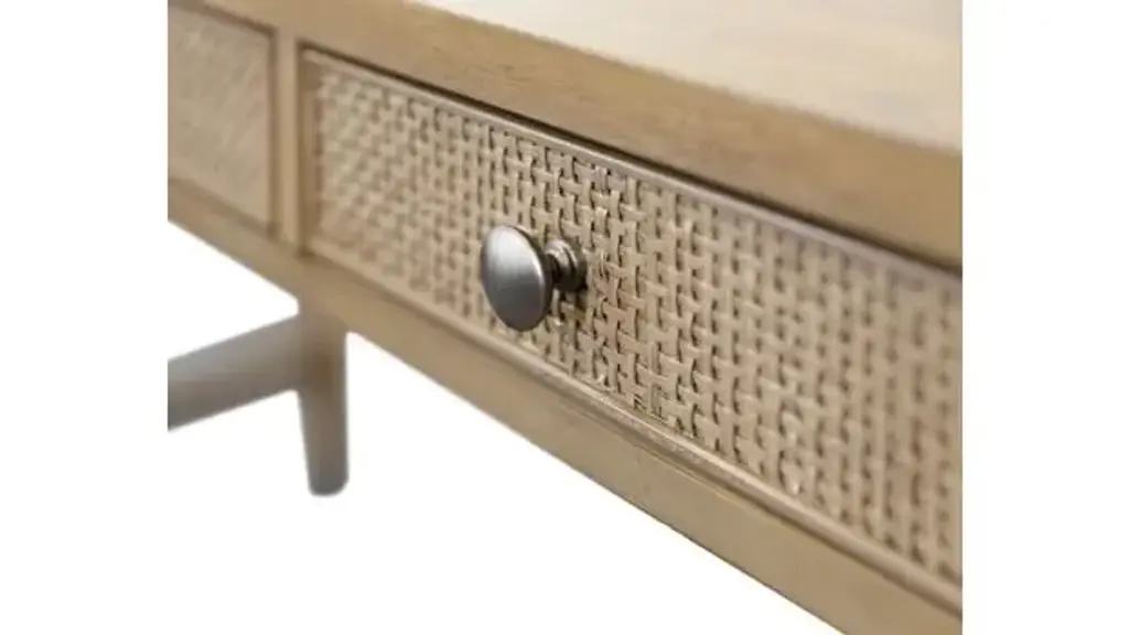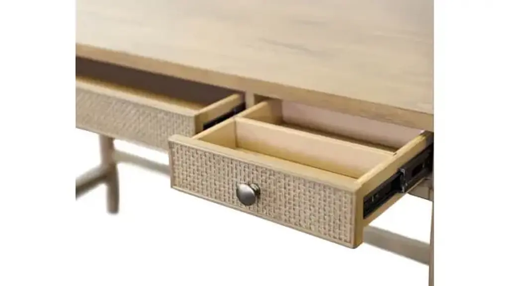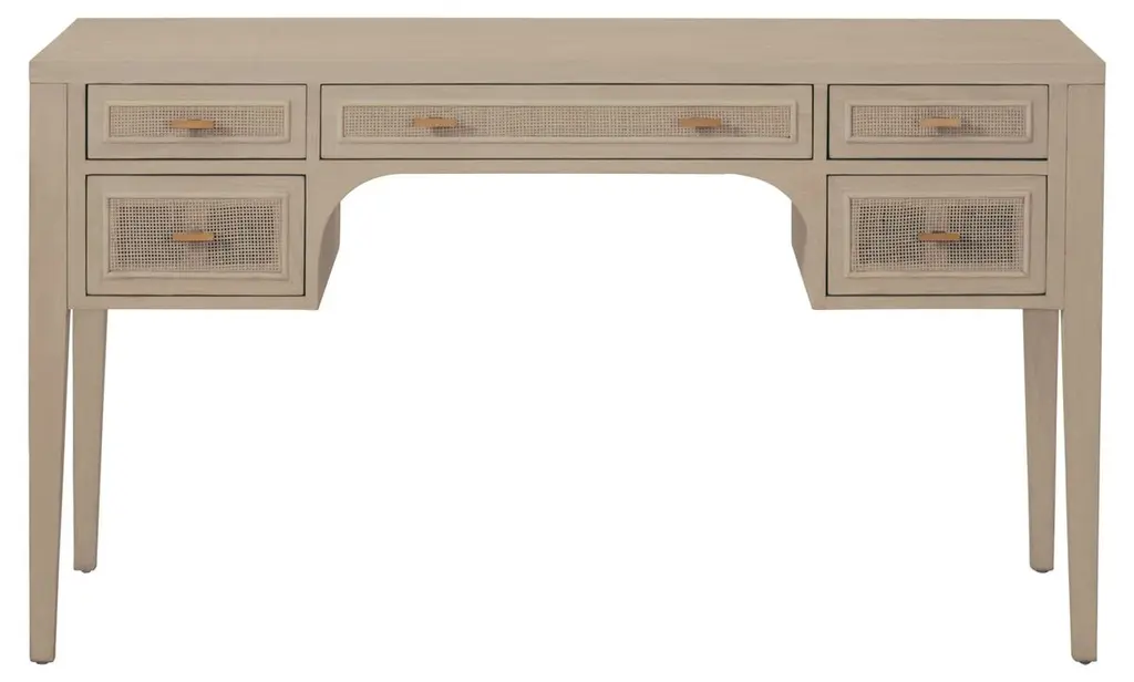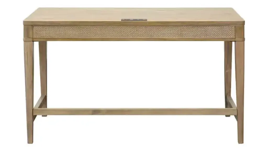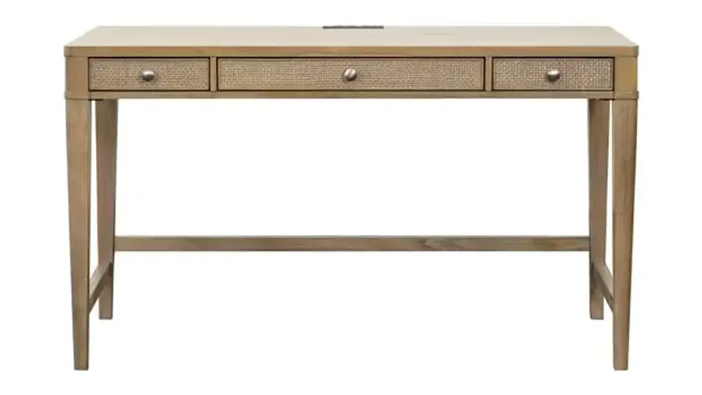 Upgrade your small office with the Quincey collection - sized just right with convenience and efficiency in mind. The warm mid-tone brown finish with golden highlights brings out the natural beauty of the wood veneers. Woven rattan adds natural texture. Delicate pewter knobs are the perfect accent to this simple yet stylish collection. Includes Pencil drawer with ball bearing glides, two utility drawers for additional storage. Power Center with AC power outlets and USB 2.0 ports for convenient charging. Finished on all sides. Overall Dimensions: 54"W x 24"D x 31"H. Ships ready for easy assembly.