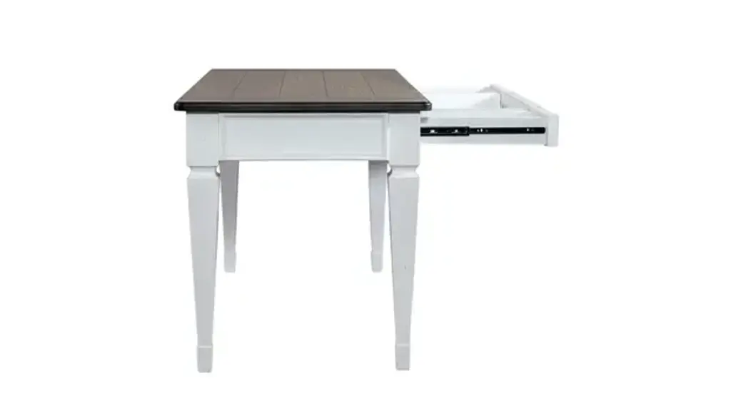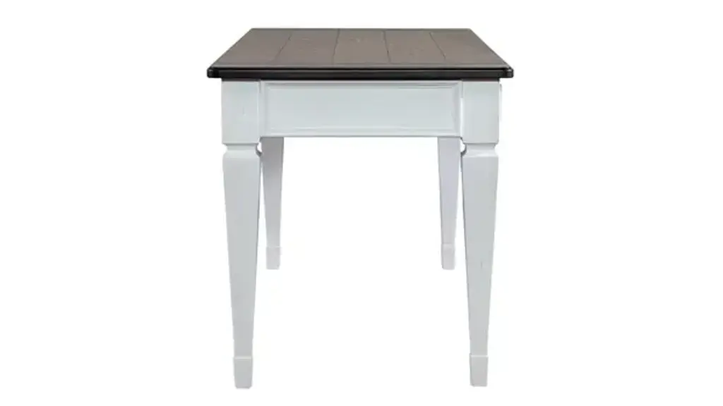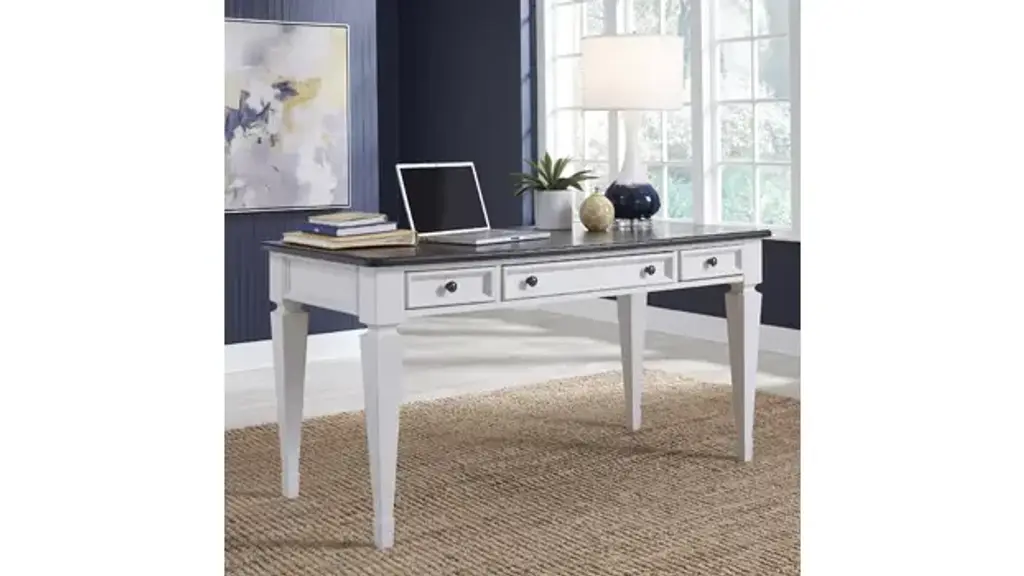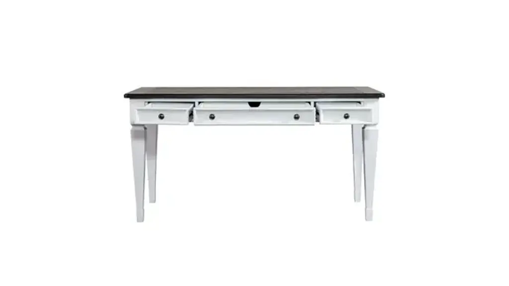 Reinvent your style with a memorable piece. The Allyson Park writing desk is crafted of pine solids with cathedral white oak tops and pine veneer fronts. This piece features a wire brushed white finish with a charcoal planked top. English Dovetail Construction. There are three full extension wood framed drawers including a center flip down keyboard tray, anchored by square tapered legs. Create a classic look with a casual feel with the Allyson Park writing desk. Overall Dimensions: 60" W x 28" D x 30.5" H. Ships ready for easy setup.