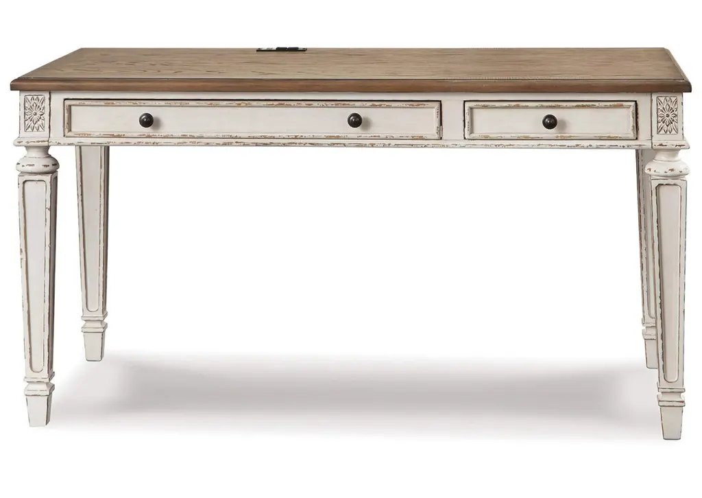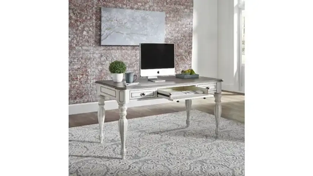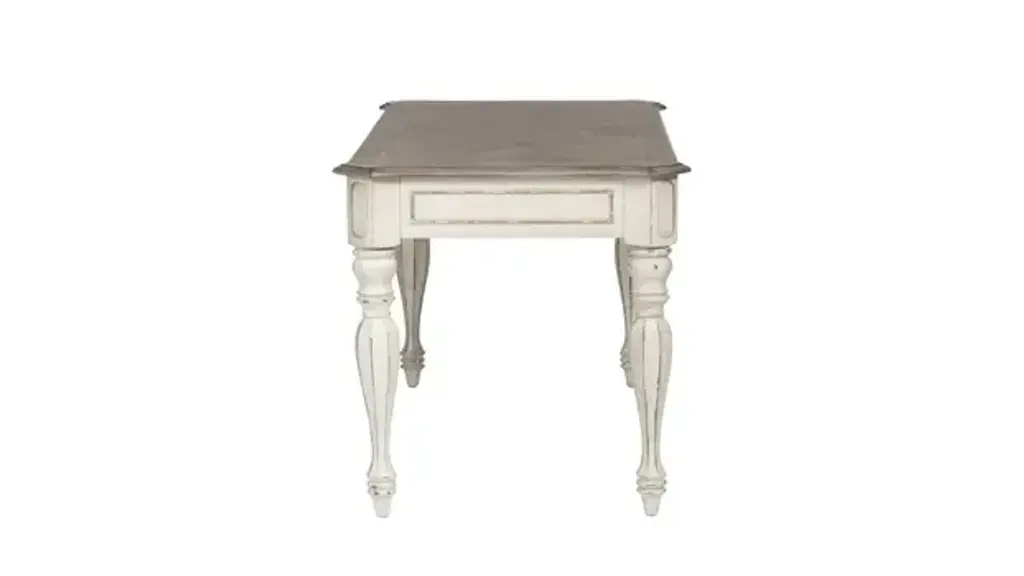 It’s never been easier to be elegant with the Magnolia Manor writing desk. Crafted of poplar and rubberwood solids with white oak and birch veneers, this piece features an antique white finish with heavy chipping and distressing with a weathered brown top with whitewash. The top has a unique fancy face veneer pattern and canted corners. There are three full extension drawers with bead molding, including the center drawer that features a flip-down keyboard tray, all accented with antique pewter knob hardware. The faceted turned legs add character to this desk. * Flip down keyboard drawer - 20"W x 17"D x 2-1/4"H * Side drawer - 10-1/2"W x 17"D x 2-1/4"H * Apron to floor clearance - 24" Blending of European influences makes Magnolia Manor a truly unique style for any home. Ships ready for easy setup.
