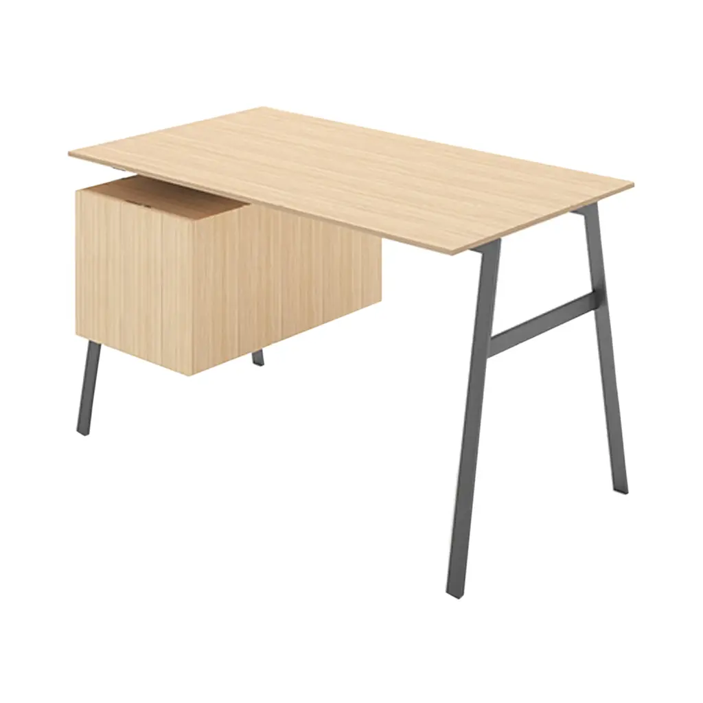 This desk features a floating drawer design that creates an open appearance. The file drawer fits both letter and legal-size files and includes a concealed compartment to keep cables and accessories organized. The drawer fronts come in wood veneers or high-gloss lacquer options.