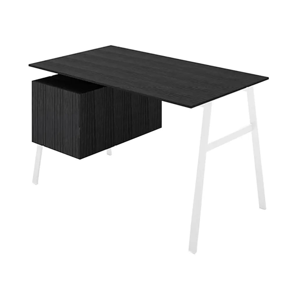 This desk features a floating drawer design that creates an open appearance. The file drawer fits both letter and legal-size files and includes a concealed compartment to keep cables and accessories organized. The drawer fronts come in wood veneers or high-gloss lacquer options.