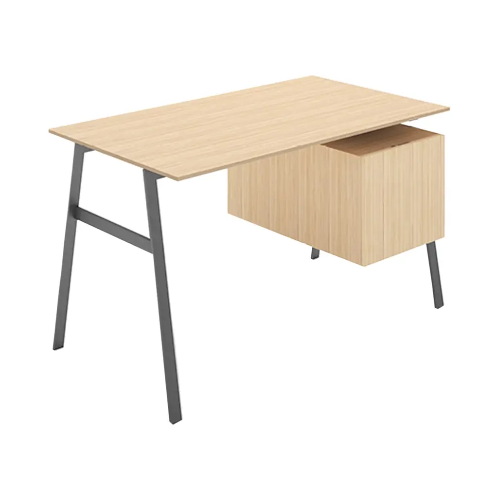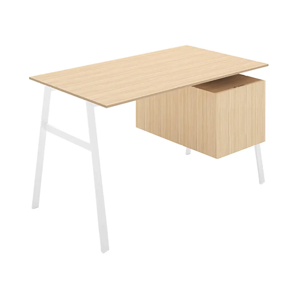 This desk features a floating drawer design that creates an open appearance. The file drawer fits both letter and legal-size files and includes a concealed compartment to keep cables and accessories organized. The drawer fronts come in wood veneers or high-gloss lacquer options.