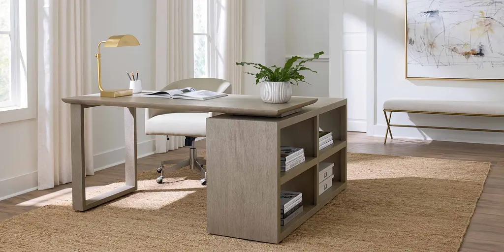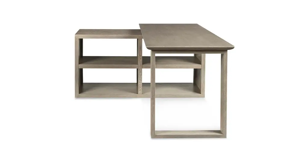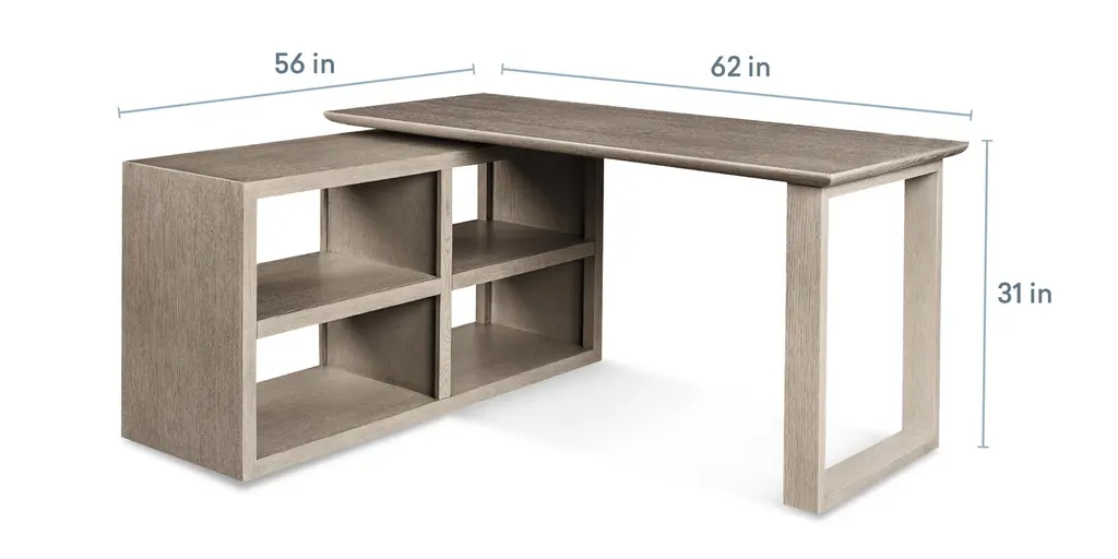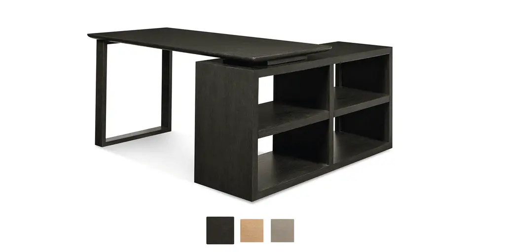 360 adaptability at a mere swivel is the promise made by our HomeWork L-Shaped Desk. The base of the desk features 4 open shelves and is the foundation for a swivel-top writing surface that can form a right or left L-Shape or any angle in between. Perfect for smaller or multi-use spaces, its footprint can easily be consolidated when not in use. The desk is finished on all sides and its smoothly grained, quarter-sawn White Oak veneer is available in the same 3 finishes as all the pieces in the HomeWork Collection. Create your impeccably styled, fully functional home office in one fell (and customized) swoop!