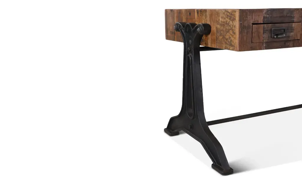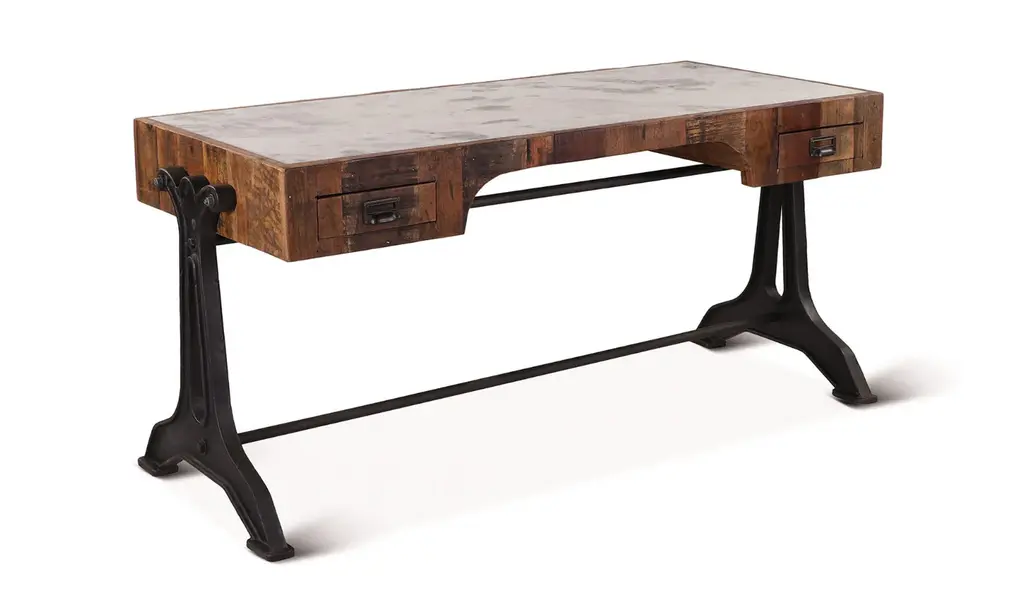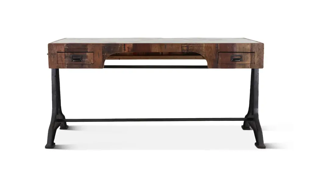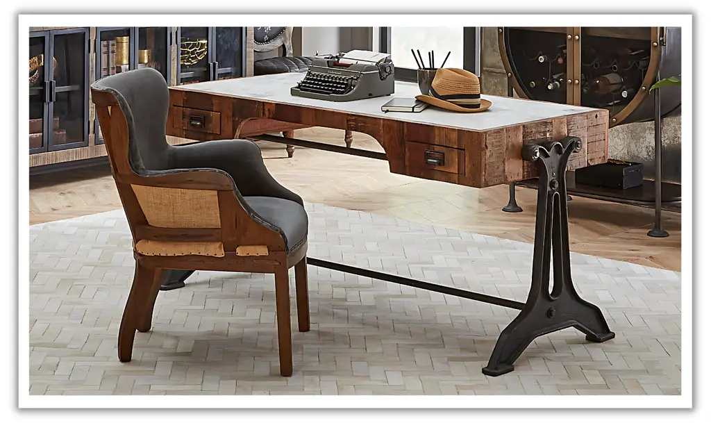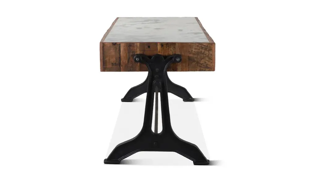 The Bowery Wooden Office Desk combines rustic charm with industrial design, making it a practical addition to any workspace. The desk features a sturdy iron pipe base, welded for durability, which supports a natural marble top. The marble surface, varying in light shades to medium gray with occasional white streaks, adds a unique and elegant touch to the desk's overall design. This desk is not just about aesthetics; it offers a functional workspace that can accommodate your daily tasks. The reclaimed wood accents complement the natural marble, creating a balanced and refined look suitable for both home offices and creative studios.