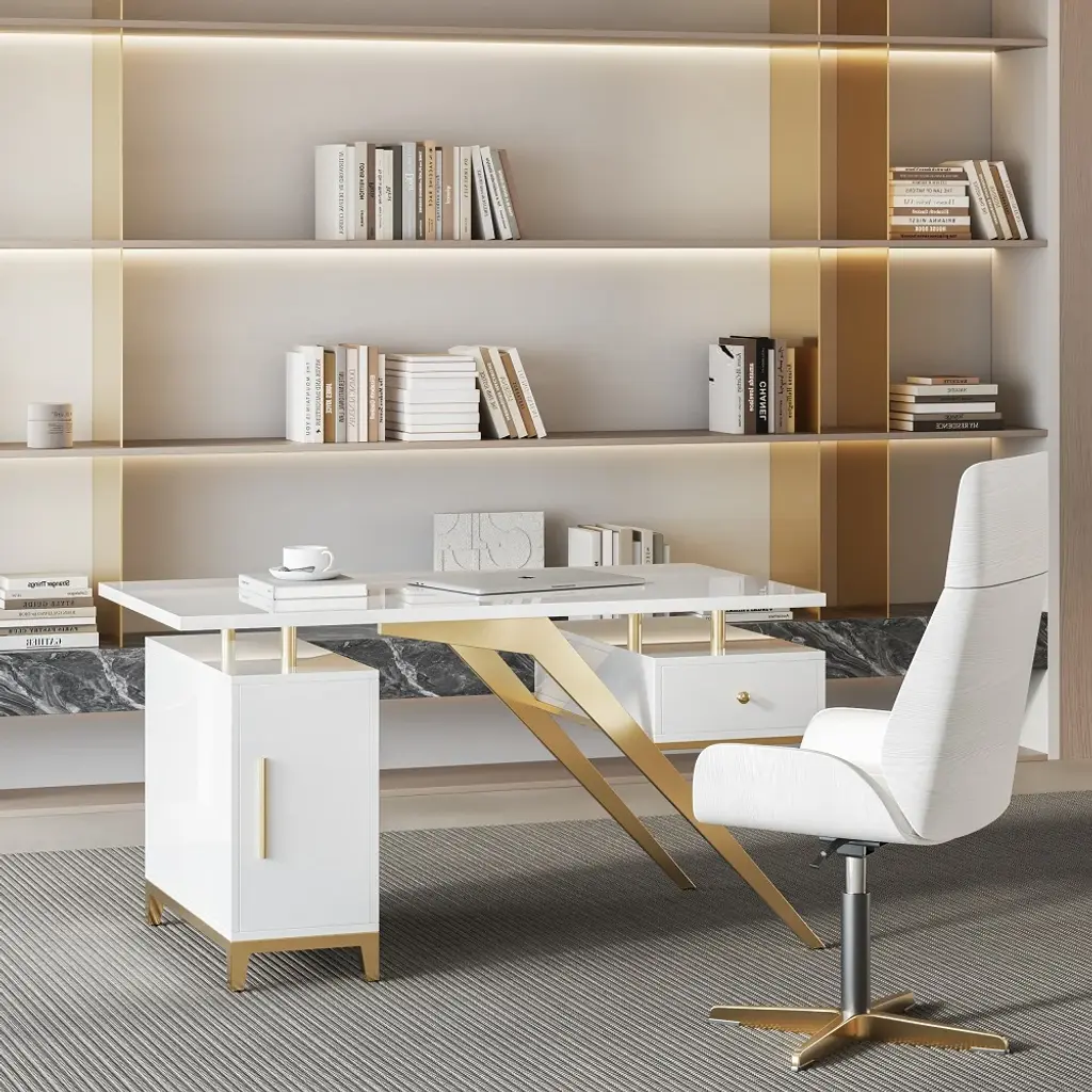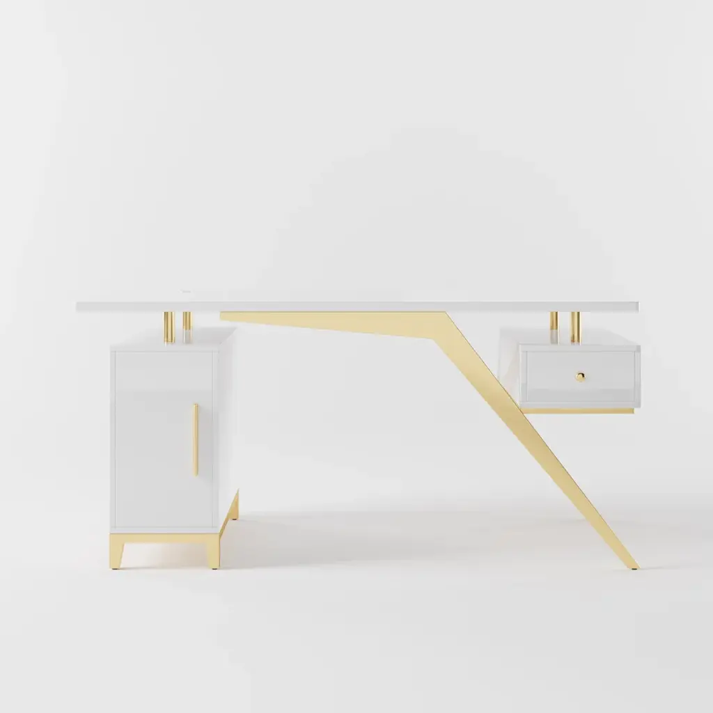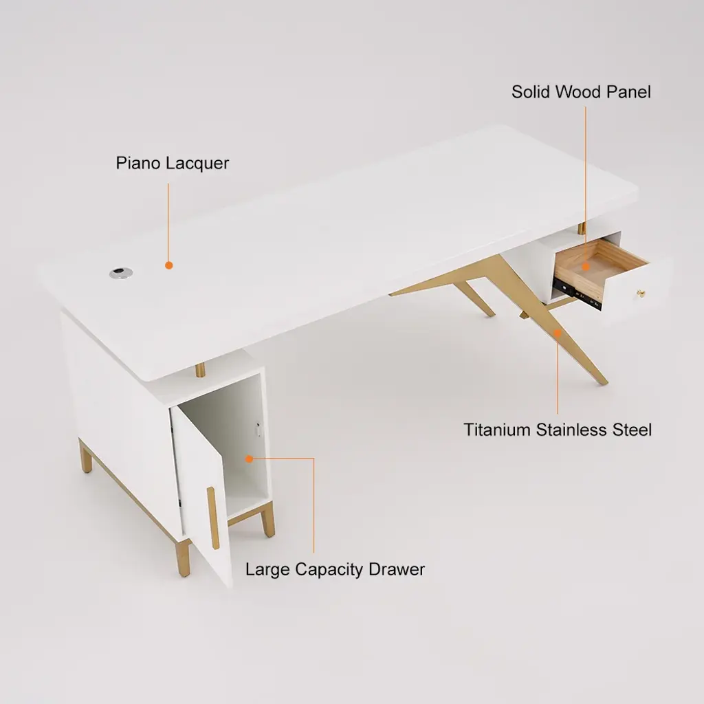 Elevate your workspace with this sleek executive desk blending modern aesthetics with practical functionality. The titanium gold stainless steel legs complement the high-gloss engineered wood surface, creating a light-luxury style perfect for contemporary offices. Featuring integrated storage and durable engineered wood construction, it offers both style and substance for discerning professionals.