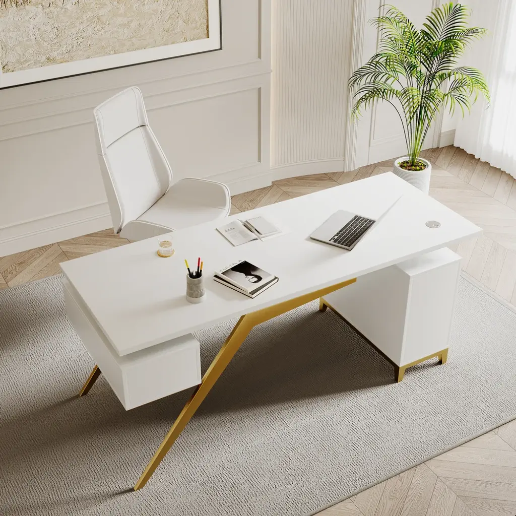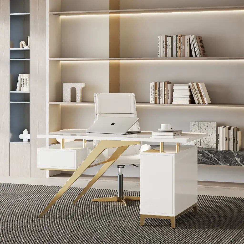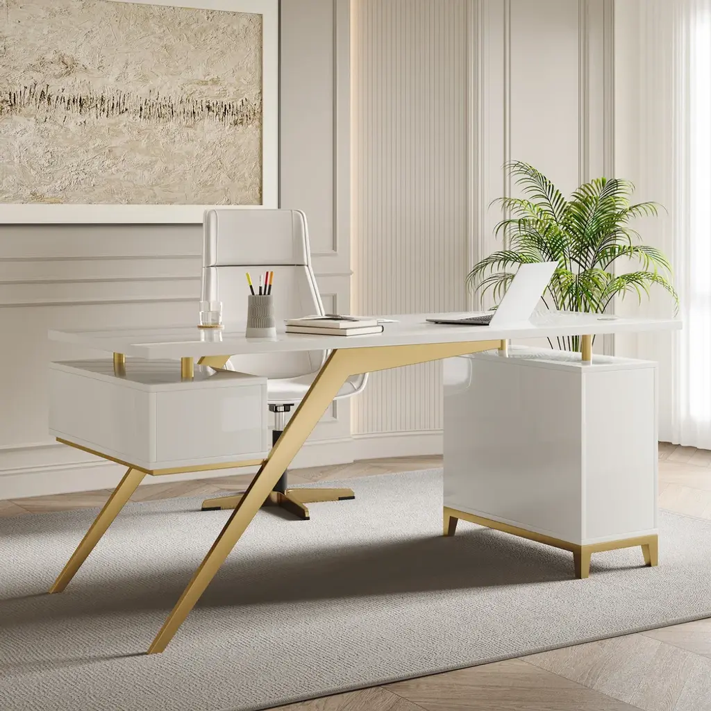 Elevate your workspace with this sleek executive desk blending modern aesthetics with practical functionality. The titanium gold stainless steel legs complement the high-gloss engineered wood surface, creating a light-luxury style perfect for contemporary offices. Featuring integrated storage and durable engineered wood construction, it offers both style and substance for discerning professionals.