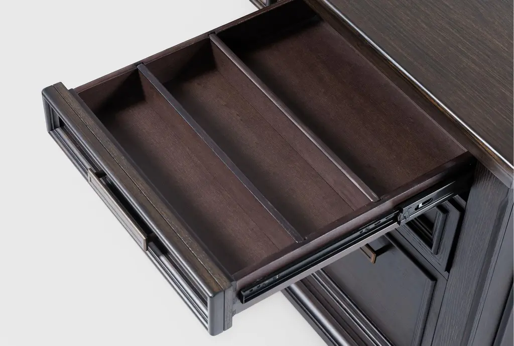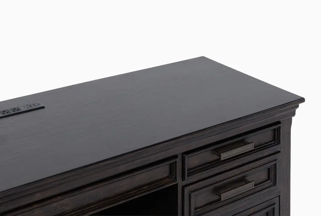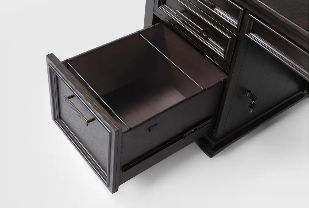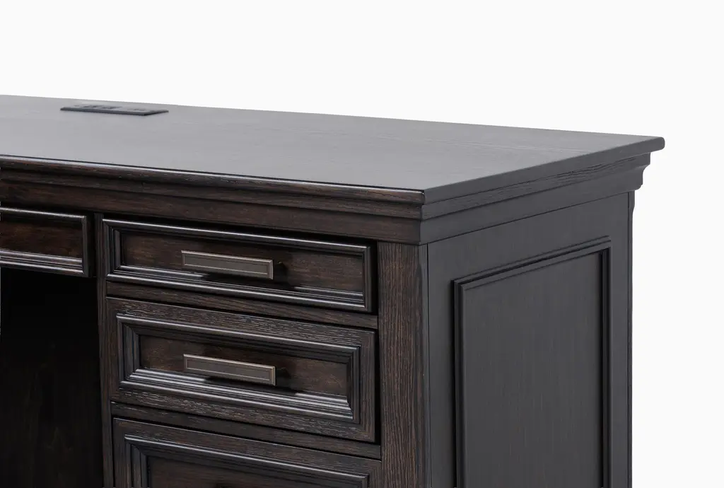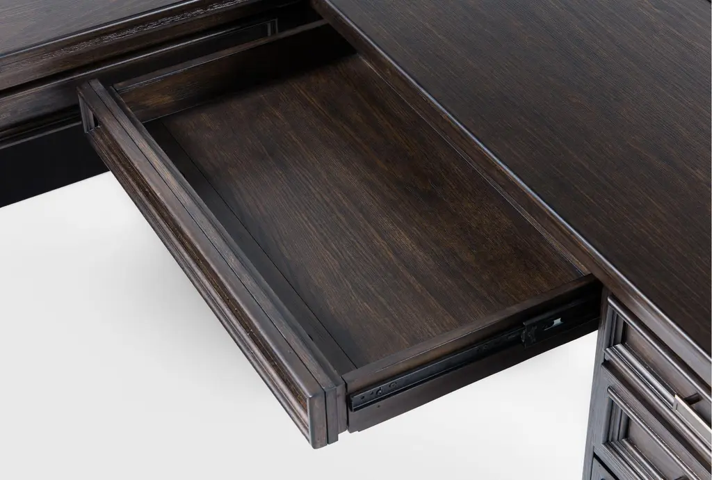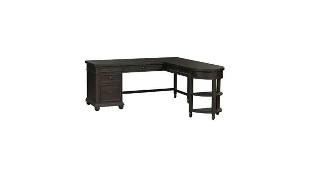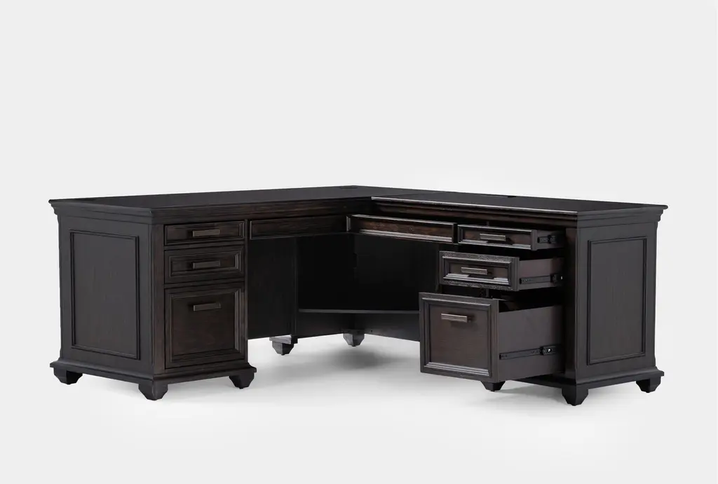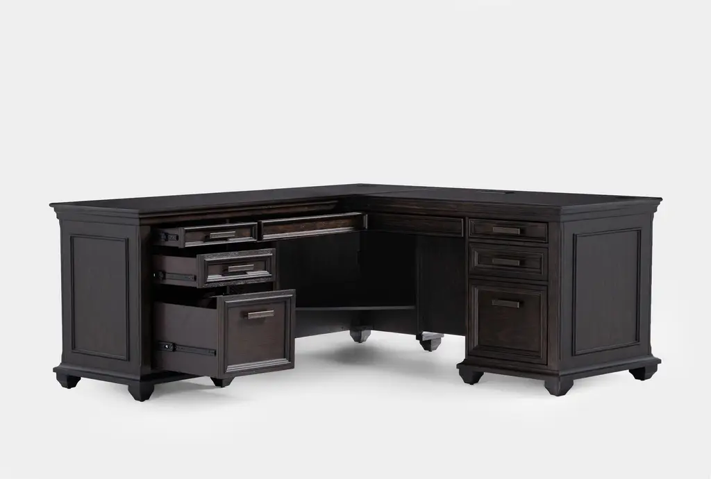 Introducing the Idris 68" L-Shaped Executive Computer Desk, the perfect addition to your home office. This traditional desk offers ample space for all your work needs, crafted with birch veneer and poplar solids for durability and a timeless look. The rich brown finish adds a touch of sophistication to any workspace.