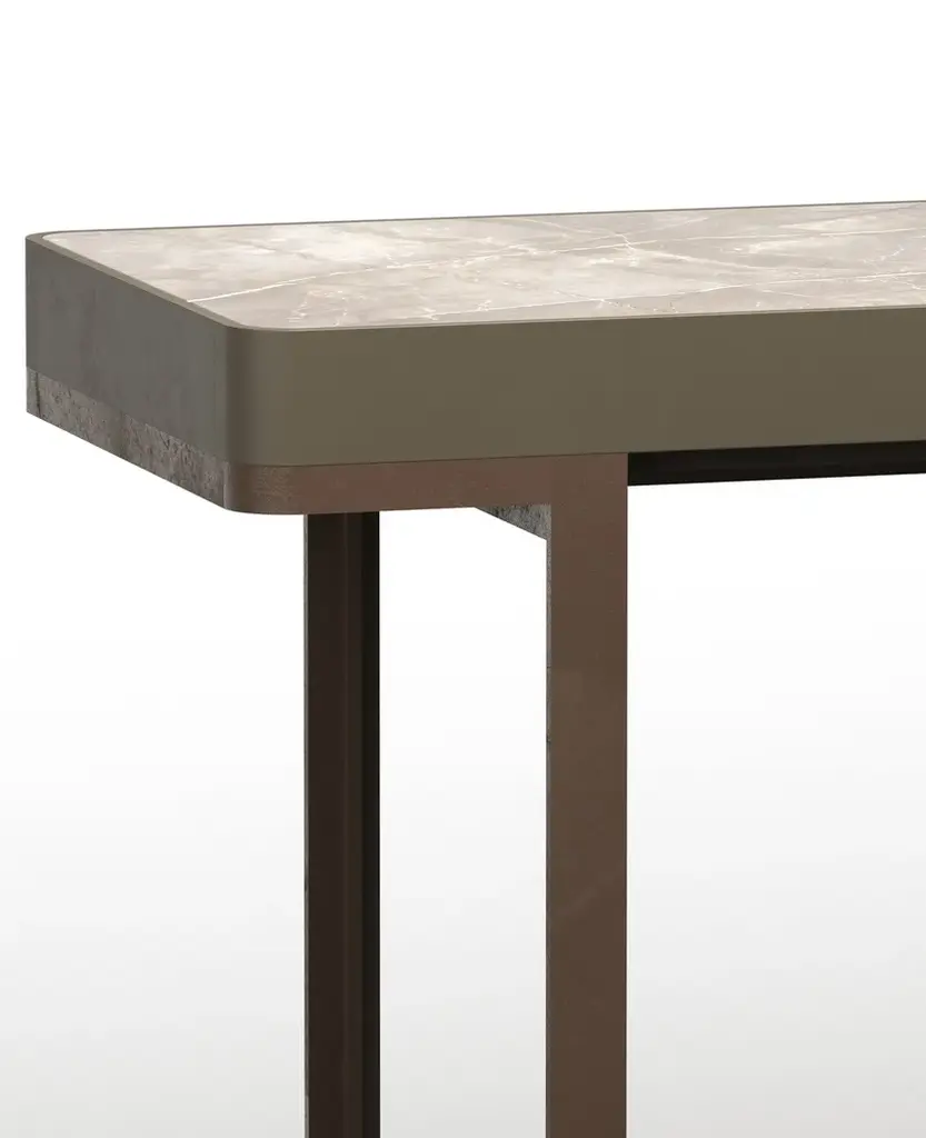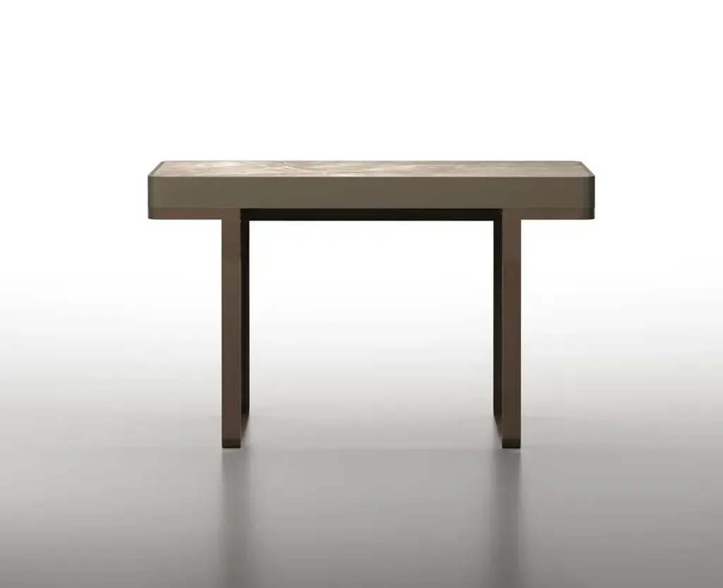 The Imperio Writing Desk inspired by the Lisbon square of the same name with its long square side is a tall desk with a top that can be enhanced with a variety of fine finishes, such as marble or back-painted glass. A central drawer divides its side symmetry supported by long metal legs.