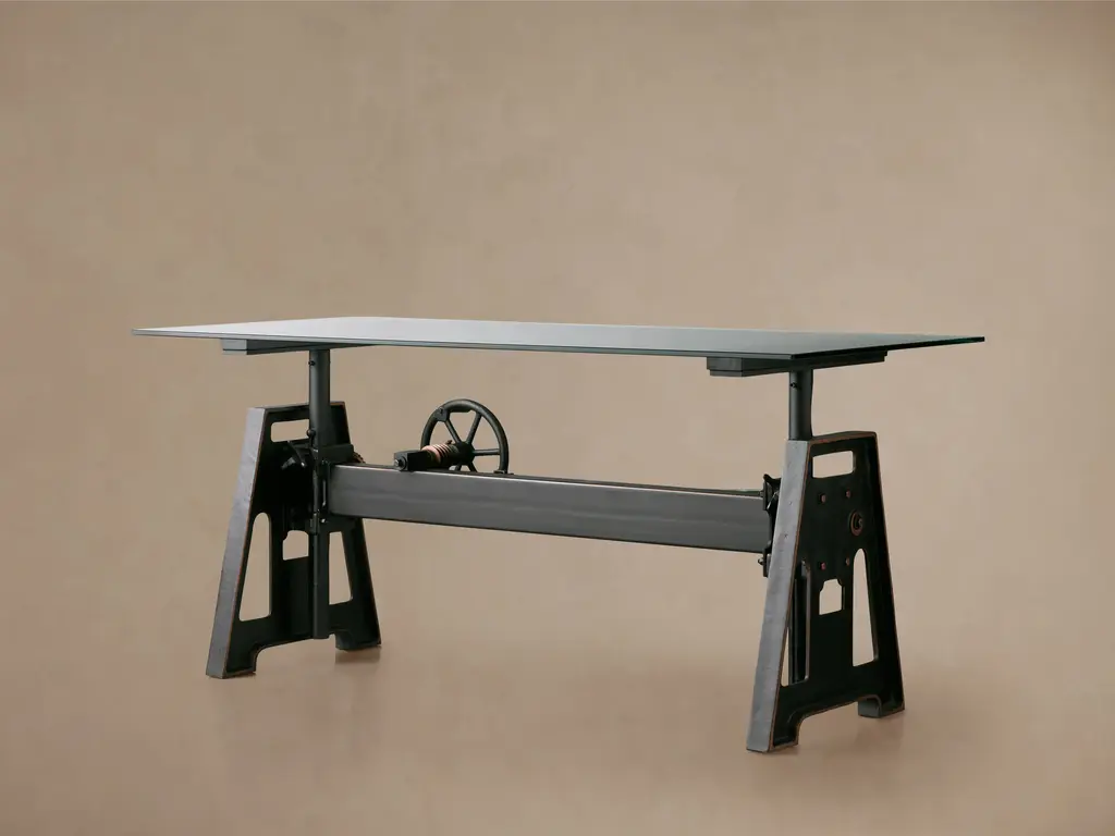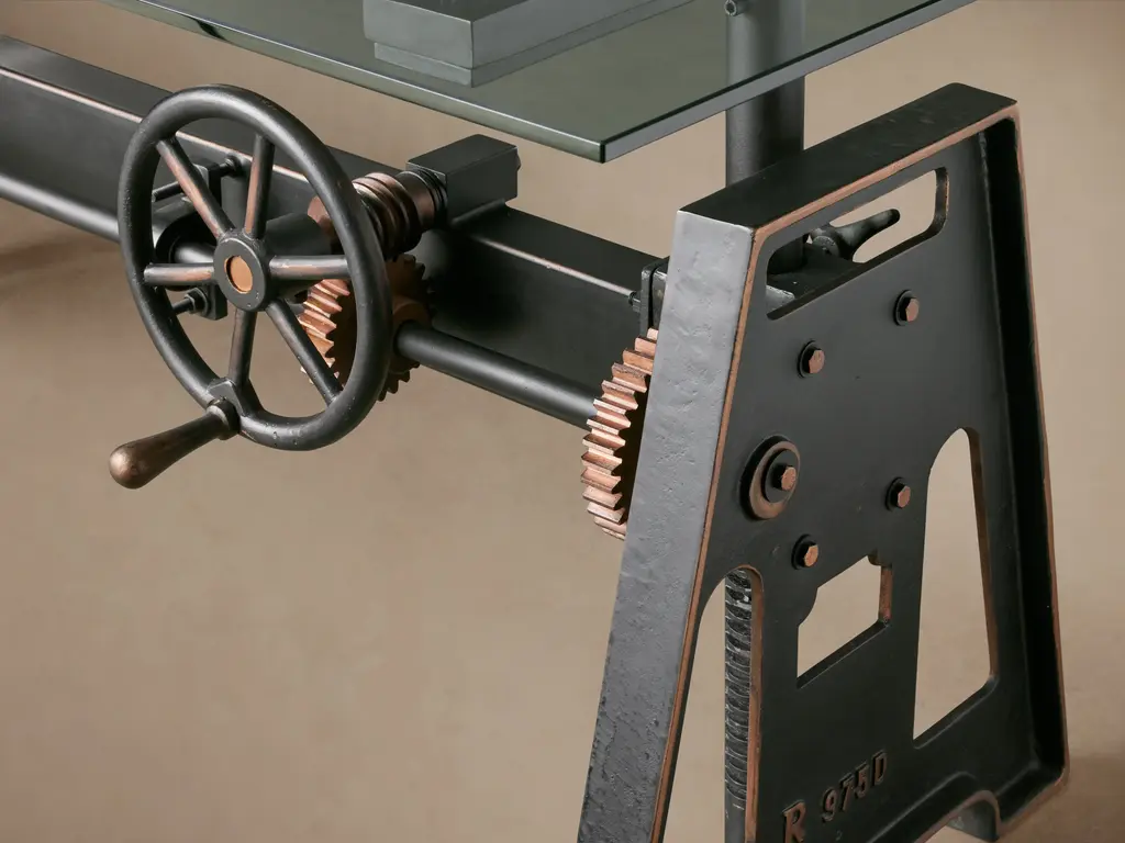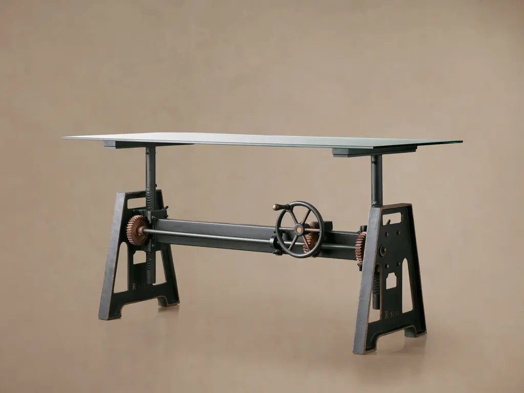 A masterpiece of modern design, the base of our Industrial Crank Desk is cast from solid iron and features a functioning wheel-and-gear mechanism. A versatile desktop, crafted from tempered glass, can be adjusted to create the perfect surface for any setting.