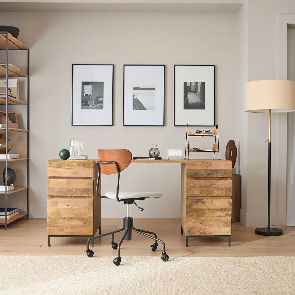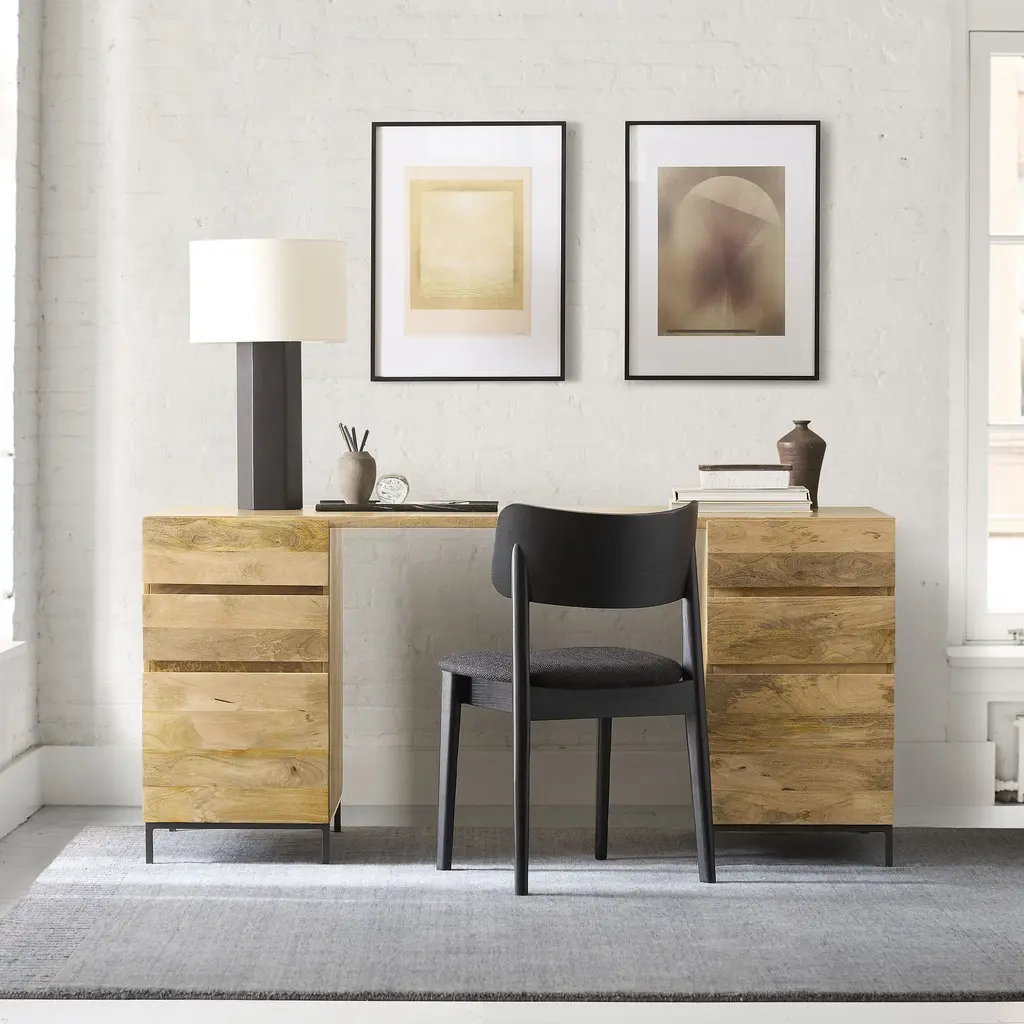 It's made from richly grained solid mango wood. Blackened steel frames support the desk. It comes with two attached box file units. There's plenty of space to work, craft & more.