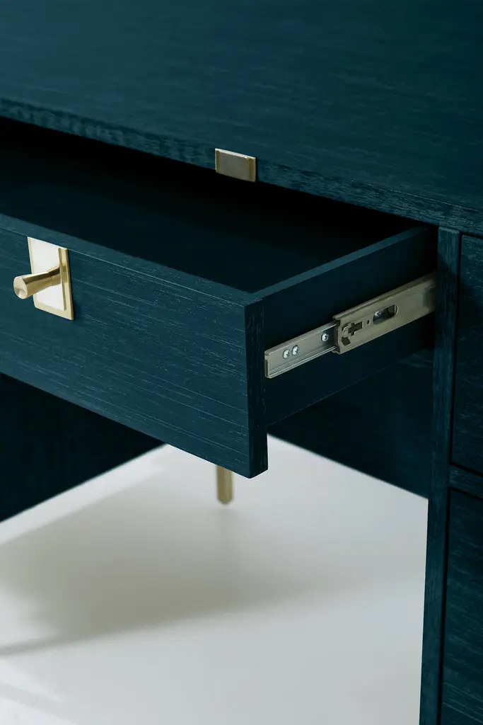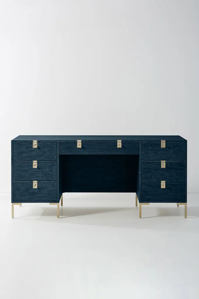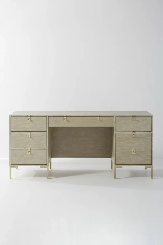 Defined by a textured anigre veneer facade and accented with stacked silver and brass hardware, our Ingram collection is the epitome of contemporary luxury. Perched on sleek, gleaming brass legs and outfitted with power outlets to accommodate your monitor set-up, this executive desk is a welcome centerpiece for a home office or workspace.For ordering assistance and more, please contact us. For aesthetic advice and tips to help decorate your space, enjoy our complimentary home styling services.For more information on the materials and techniques of this piece, click here.