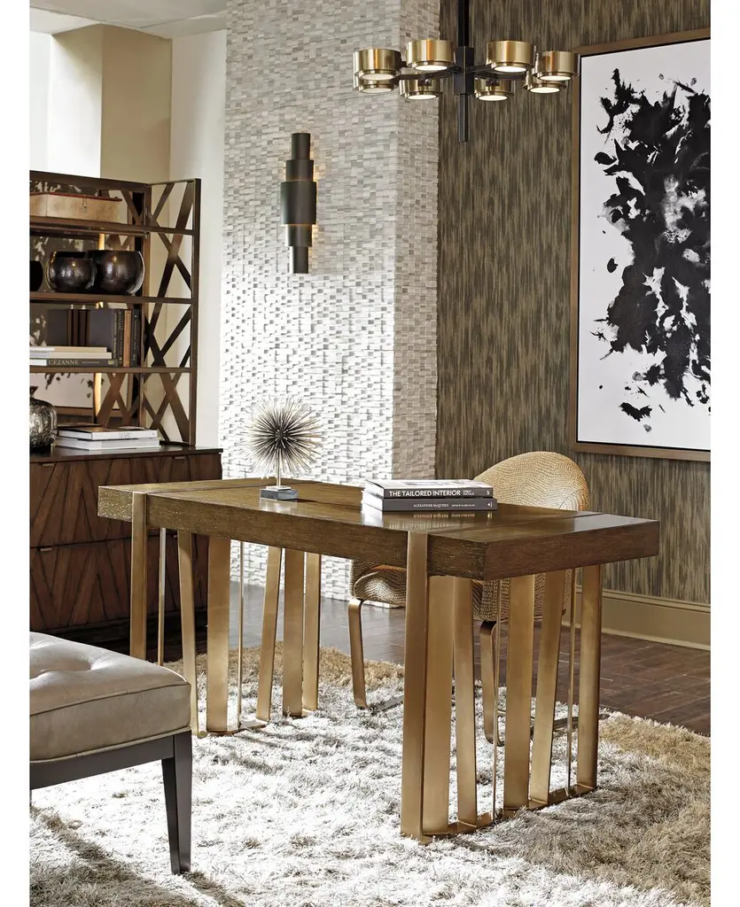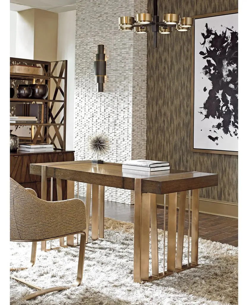 Crafted of hardwood and flanked with wide bands of interlocking steel, this ultramodern writing desk adds an abundance of structure and shine to its surroundings. A mocha stain seals in the look, protecting the distinctive grain of its white oak veneers.