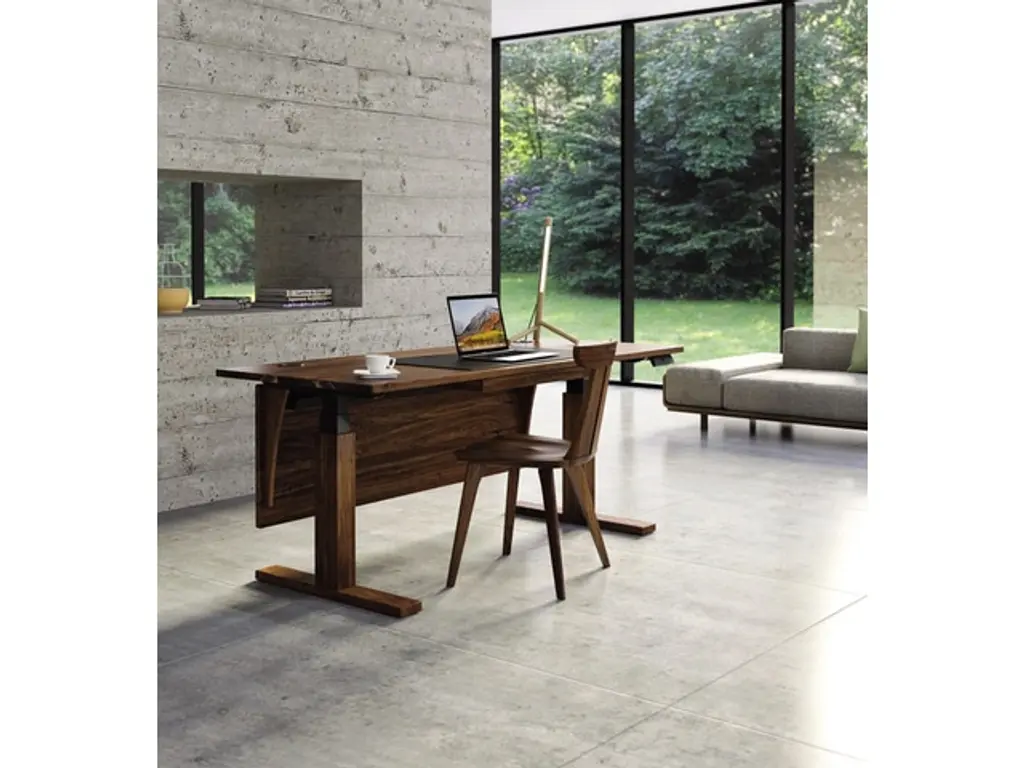 *Desk can be ordered with other options and woods for a longer wait time, please call 410-381-7577 for more information The Invigo Sit-Stand Desks are crafted in solid cherry, solid walnut or solid ash hardwood and Made to Order in several finishes*. Invigo is a highly configurable series of sit to stand desks that can be specified in a range of sizes and finishes. Built on a high quality three-stage, dual motor lift base with three programmable positions, Invigo desks raise from 25” to 51” inches in height. Desks may be fitted with a variety of wire management, storage, decorative and computer accessories. Perfect dovetail cuts, edge shapes, hole drills and other intricate processes are executed with computer numerically controlled (CNC) machining centers. Copeland craftspeople combine this state-of-the-art technology with traditional woodworking techniques to turn out the highest quality joinery, case construction, and finishing. Your Copeland furniture will be enjoyed for generations. Asymmetrical English dovetails – the traditional gold standard in joinery – are used in drawer construction. Drawer bottoms are “jet welded” firmly in place adding to overall rigidity while minimizing vibration and rattling. Drawer box interiors are sanded smooth and fully finished. Glides are adjustable to keep proper alignment and guarantee proper function in any climate. Pivot stops prevent drawers from being pulled out of the case Self-locking dovetail joints are used from cross rails, keeping them from separating from side panels and adding to strength. Solid hardwood interior corner blocks stabilize bed, case, table and chair legs. Bed side rails are joined to the headboard and footboard with a rigid inserted bolt. Case backs are made of selected veneer panels are Copeland Furniture continues to manufacture 100% in the United States. The challenges of domestic manufacturing require that we embrace state-of-the-art manufacturing whenever possible. This has helped us remain competitive and results in a superior product.