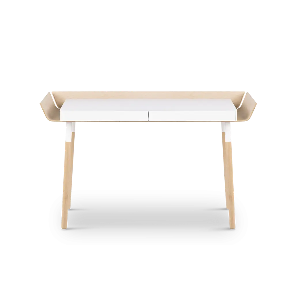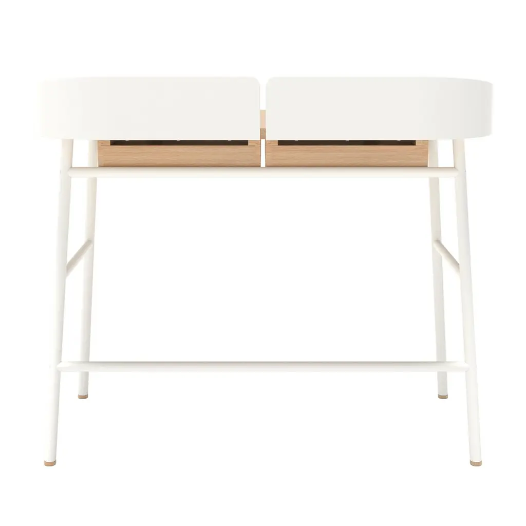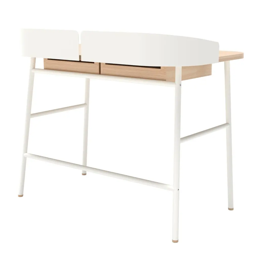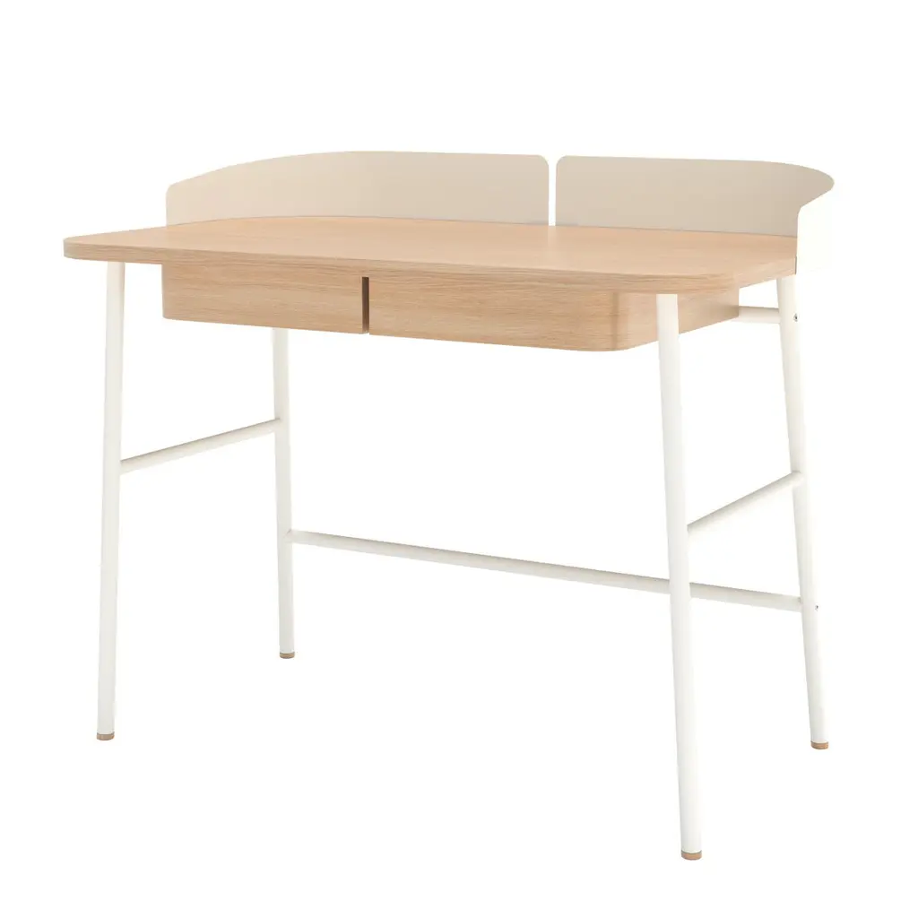 Iridescent White Metal Victor Desk Natural Oak by HARTODimensions: W 100 x D 60 x H 81.5 cm. Materials: MDF wood veneer, Painted metal. Weight: 19.5 kgThe Victor desk is an invitation to concentration and creativity. Generous in its shapes and in the surface area it offers to sit comfortably, it is nevertheless remarkably compact. Despite its roundness, Victor does not forget rigor: a lacquered metal structure with a finely taut line, supporting two drawers with clever compartments. The Victor desk is made in Portugal. Its 100cm top is in oak veneer and its structure is in lacquered metal. The Victor desk is a creation of Pierre-François Dubois.About: Hartô, a French furniture brand, was born in 2012 from the desire of its founders to offer a different design, less elitist, which combines the useful with the beautiful. A light, joyful design, as if to say "I'm fed up" (with boring furniture): this is the meaning of the word harto in Spanish. The first pieces of the collection, the desks offer a new vision on a market that was then quite sparse, and offer functional tips and a joyful, colorful design, out of step with the archetypes. The foundations of the Hartô spirit are laid: a free spirit, a design of the useful, curved shapes, colors. In a word: creativity! And of course, from the beginning, this translates into collaborations with talented designers. This spirit crosses the years and the collections, evolves, refines itself, without ever denying itself. Today, audacity and creativity are still there, and are translated in a subtle way, all in elegance. At Hartô, the freedom to create is also based on strong commitments to quality and durability: the furniture is made by the best local craftsmen, who use noble materials to give life to pieces that will last through the ages.
