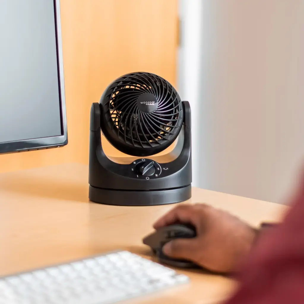 Perfect for the office, home or a dorm room, the WOOZOO personal fan offers powerful cooling air while compact size unit saves space. The adjustable fan head pivots vertically 360 degrees, with three speeds settings on tabletop circulator to meet your cooling needs. Enjoy extra-quiet cooling on the virtually silent “low” setting. Desktop fan provides up to 157 ft² area coverage, and the 70.9” cord makes it easy to reach the outlet.