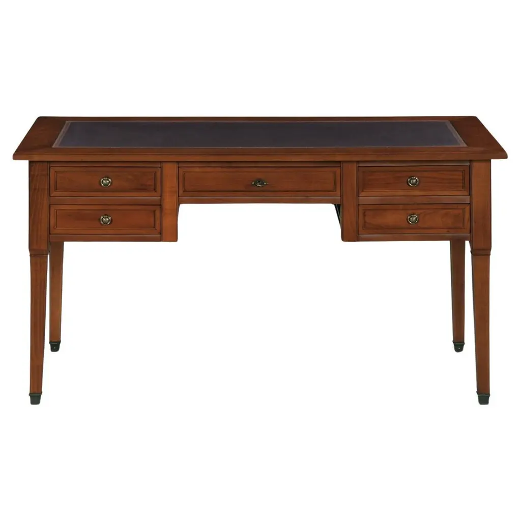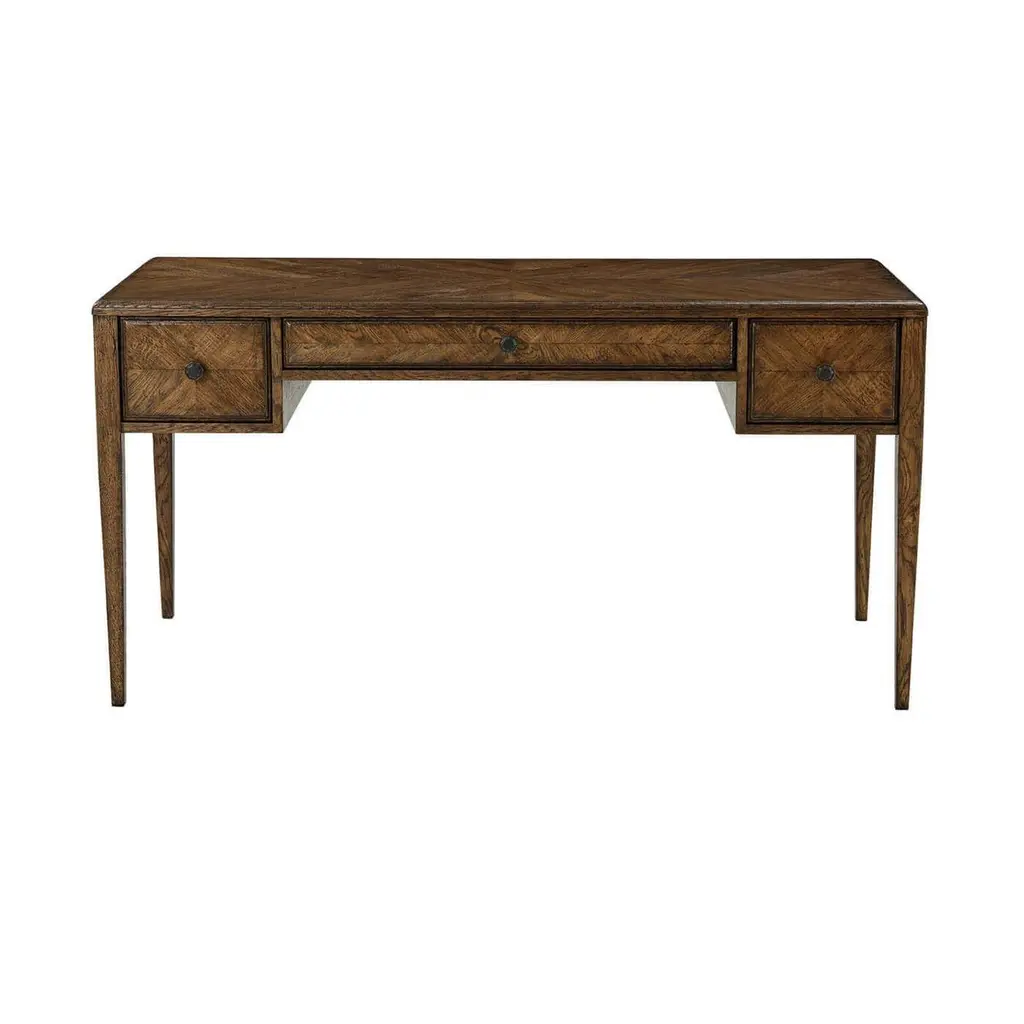 An Italian Neo-Classic style oak parquetry desk with a starburst patterned oak parquetry top to bottom. It has a central drawer flanked by two further additions. It rests on tapered legs. It has an oak finish complimented with Verde Bronze finished handles. Shown in dusk finishDimensions59.5" W x 26" D x 30" H.Clearance - Center: 24.75" H x 32.5" W