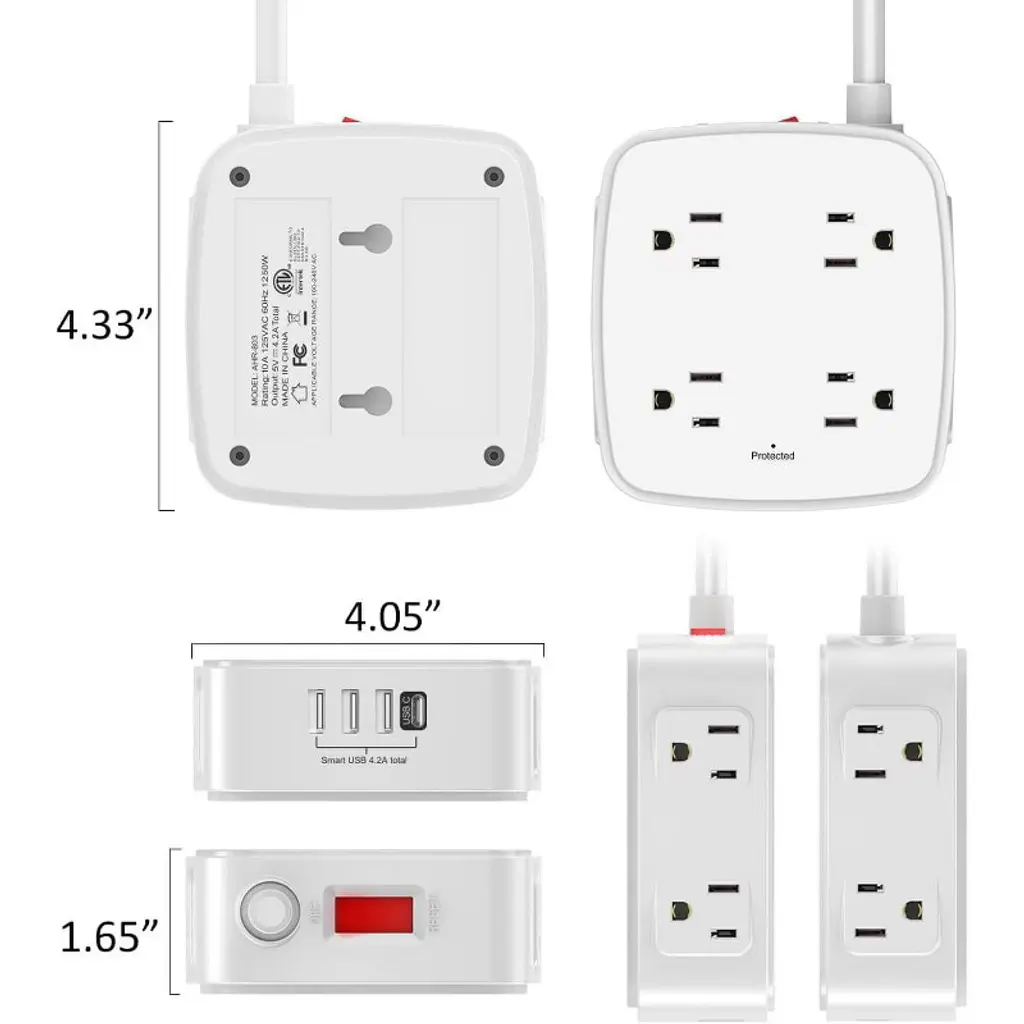 Itopfox 6 Ft Surge Protector Power Strip With 8 Outlets & 4 Usb Ports, 3 Side Outlet Extender, Flat Plug, Wall Mount, Desk Usb Charging Station White