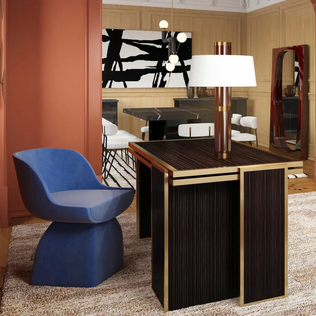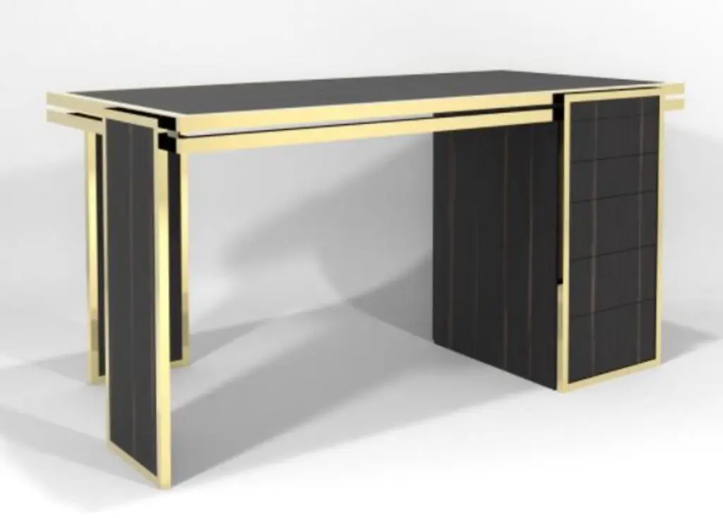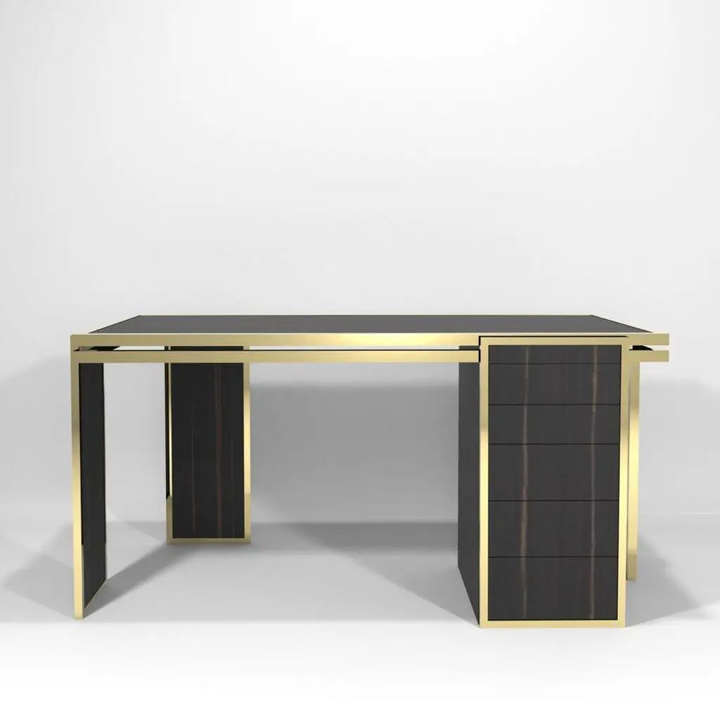 James Desk by DUISTTDimensions: W 154 x D 79 x H 75 cmMaterials: Brass and High Gloss Ebony WoodJames desk crafted with great attention to details, is a bold and exciting piece capable to add a touch of sophisticated elegance to any room. The geometric shapes and lines of this modern desk combined with the high gloss ebony wood and polished brass details create an elegant and sharp piece of furniture.DUISTT is a Portuguese high-end furniture brand.Born in Porto in 2014, the company breathes history and modernity. We blend ancient knowledge and techniques with contemporary aesthetics.DUISTT designs refined and sophisticated pieces aiming to provide major comfort and quality. Handmade pieces crafted with art that are absolutely unique and can last generations.We invite you to discover our elegant and timeless designs and we hope it brings you pleasure.
