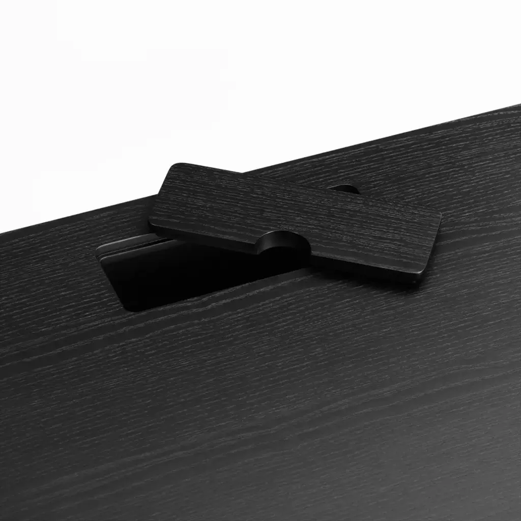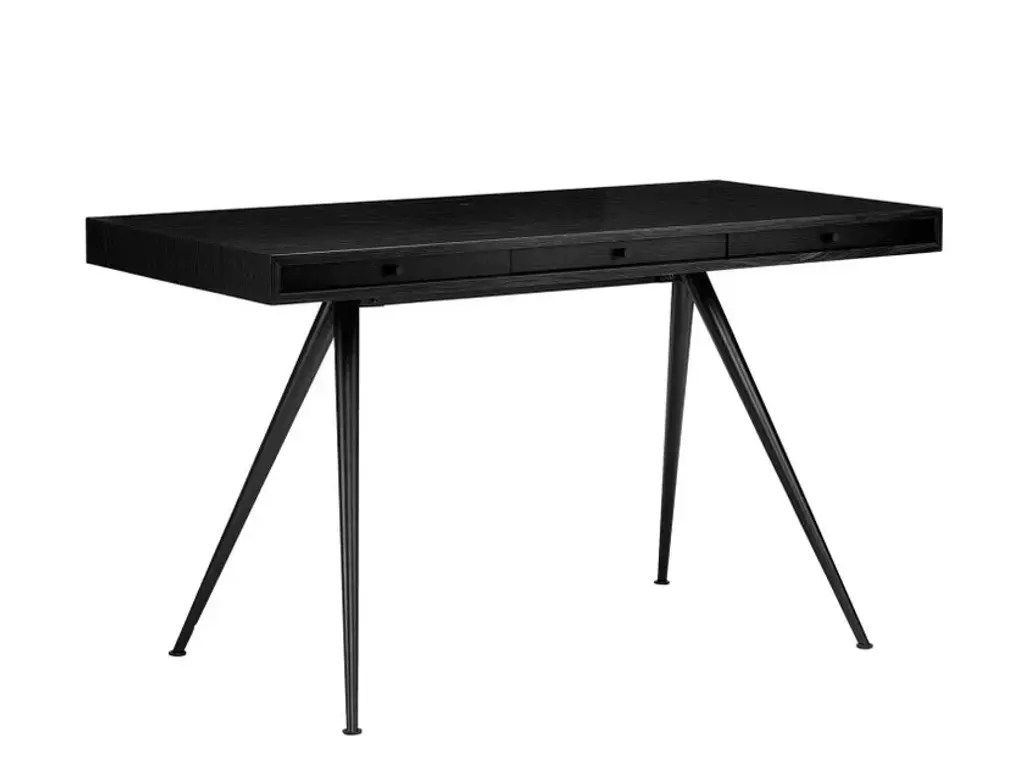 JFK Home is a reinterpretation of the classic 60s office desk. The desk has a slim table top of veneer with three inbuilt drawers. The drawers have an inner height of 4 cm, making it perfect for laptops, papers and various office supplies. Each drawer has a small knob with knurled texture, as reference to old radio buttons from the 50s and 60s. The name is a tribute to the classic Danish office desks, often used by John F. Kennedy during the 1960s.The table top core is made from MDF and available with palisander veneer or black ash veneer. The table top has a small space inside for a power distributor, making it easy to power both smartphones and laptops. The cable from the power distributor is dragged through a small hole in one of the legs, creating an elegant desk without messy cables on the floor. The desktop is supported by a leg construction of aluminum, which is available in a mat black powder coating. The conic shaped leg meets in the middle underneath the table top, which gives the table a very light and elegant expression.Core: 100% MDFVeneer: European AshSurface treatment: Polyurethan lacquerTable Legs: 100% Aluminium with mat powder coatingKnobs for drawers: 100% Aluminium with mat powder coating