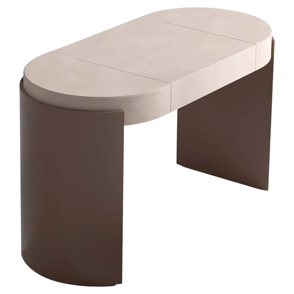 This is a modern writing desk with a sophisticated and minimalist design. It features a sleek lacquered structure with curved side panels that provie both stability and a distinctive aesthetic. The top is covered in luxurious leather, adding a refined touch and enhancing the tactile experience. The combination of high-quality materials and clean lines makes this desk a stylish and functional piece, perfect for contemporary workspaces or home office.