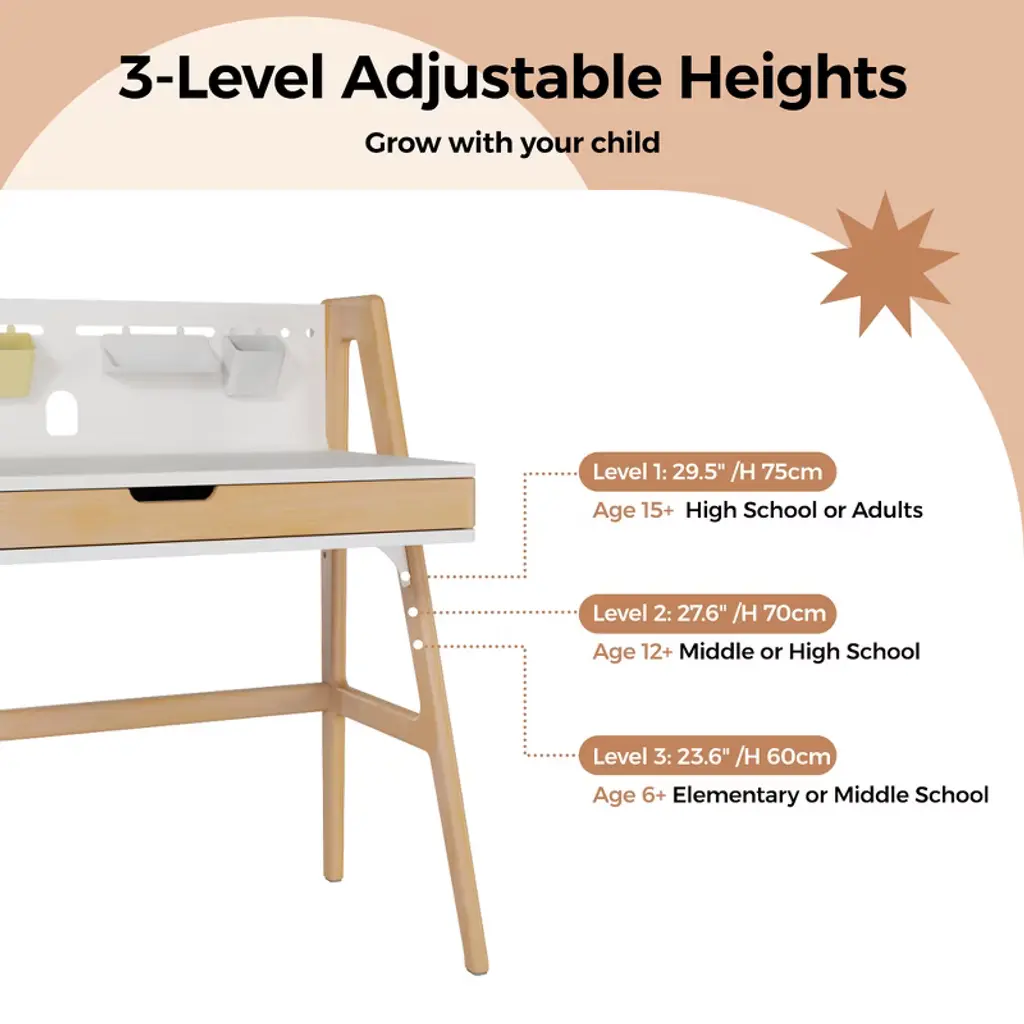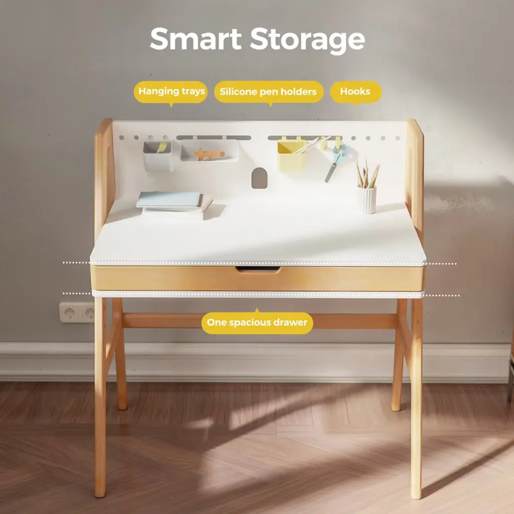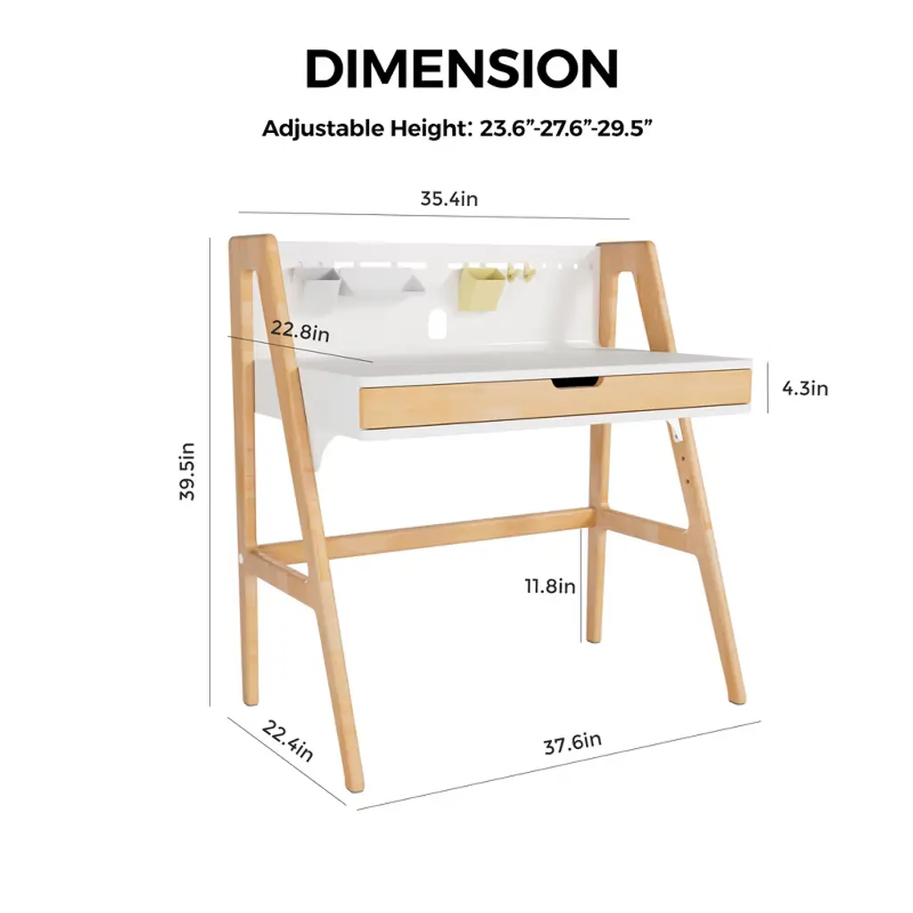 Designed for children ages 6+, this adjustable kids' study desk combines functionality with a minimalist natural wood aesthetic, ideal for compact spaces like bedrooms, balconies, or study corners. The 35.4-inch wide solid beech desktop offers ample workspace while fitting seamlessly into small rooms. Made from premium multi-layer solid wood and coated with eco-friendly water-based paint, it’s both safe and durable for everyday use. The desk features three height settings (23.6", 27.6", and 29.5") to grow with your child, promoting healthy posture over time. Equipped with high-quality German HAFELE slide rails and useful accessories like hooks, storage trays, and a side box, it encourages neat organization. Its natural beech and white finish adds a clean, cozy look that blends easily with various interior styles.