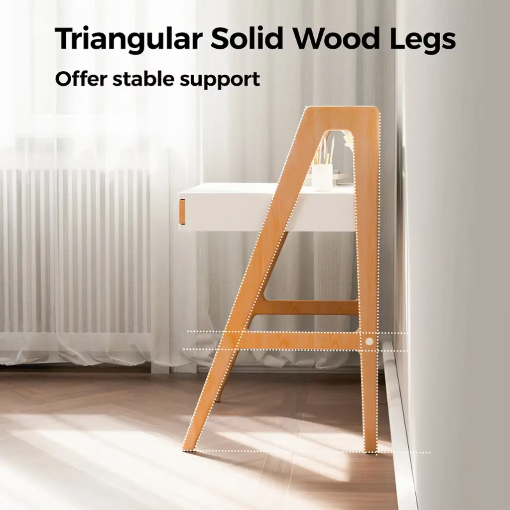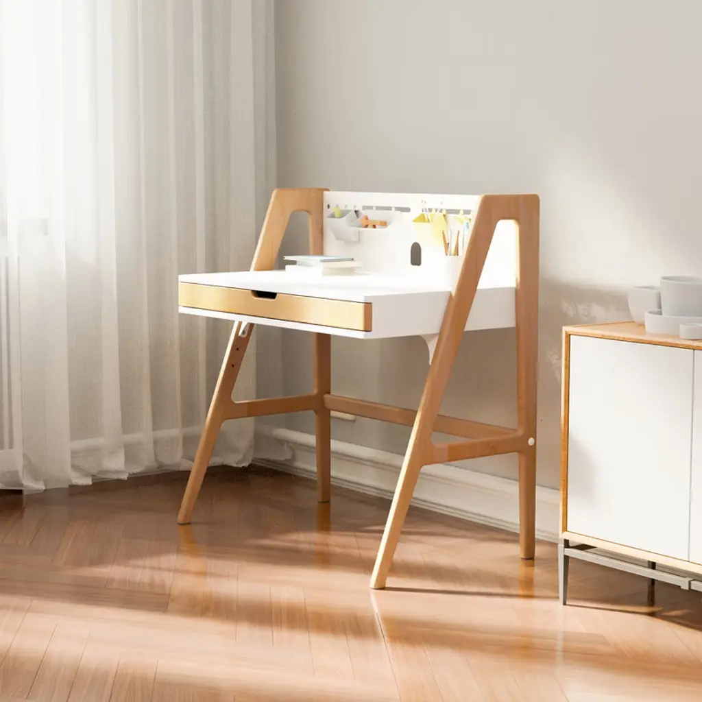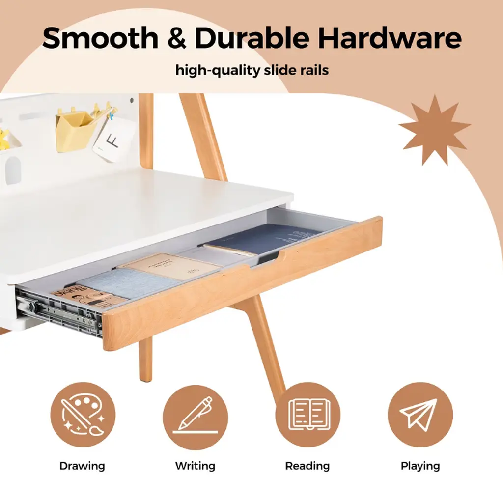 Designed for children ages 6+, this adjustable kids' study desk combines functionality with a minimalist natural wood aesthetic, ideal for compact spaces like bedrooms, balconies, or study corners. The 35.4-inch wide solid beech desktop offers ample workspace while fitting seamlessly into small rooms. Made from premium multi-layer solid wood and coated with eco-friendly water-based paint, it’s both safe and durable for everyday use. The desk features three height settings (23.6", 27.6", and 29.5") to grow with your child, promoting healthy posture over time. Equipped with high-quality German HAFELE slide rails and useful accessories like hooks, storage trays, and a side box, it encourages neat organization. Its natural beech and white finish adds a clean, cozy look that blends easily with various interior styles.