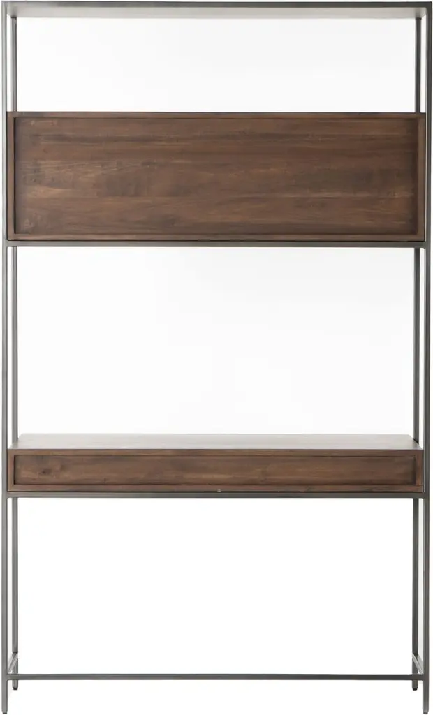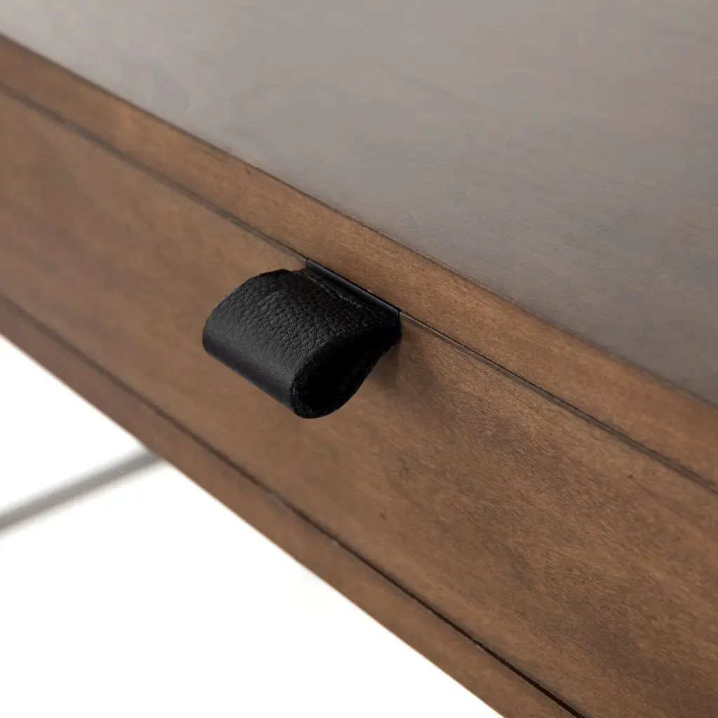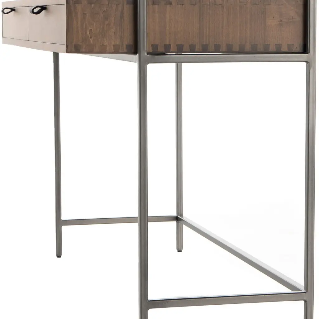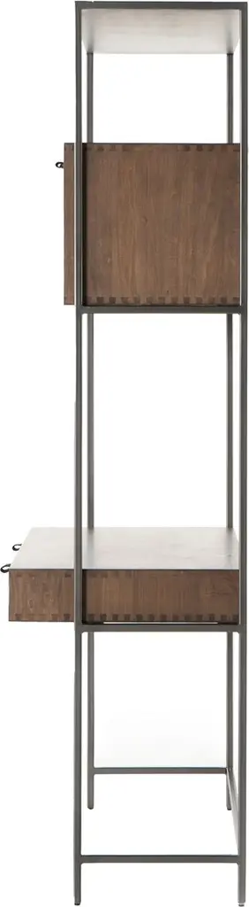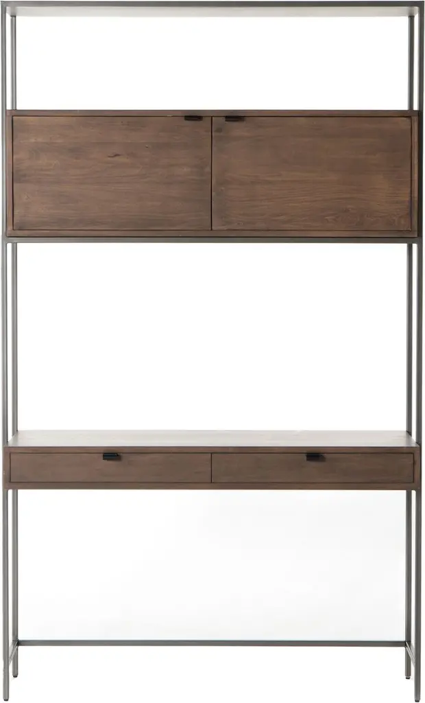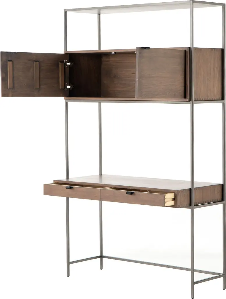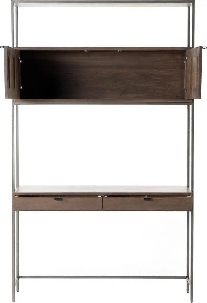A poplar cabinet and drawers with dovetail joints are paired with a minimalist iron frame, proving that opposites not only attract but are also quite attractive together. The two desk drawers and the upper cabinet offer plenty of storage, while the desktop and the shelf above the cabinet are ideal for displaying favorite objects. Leather door and drawer pulls are an unexpected finishing touch.