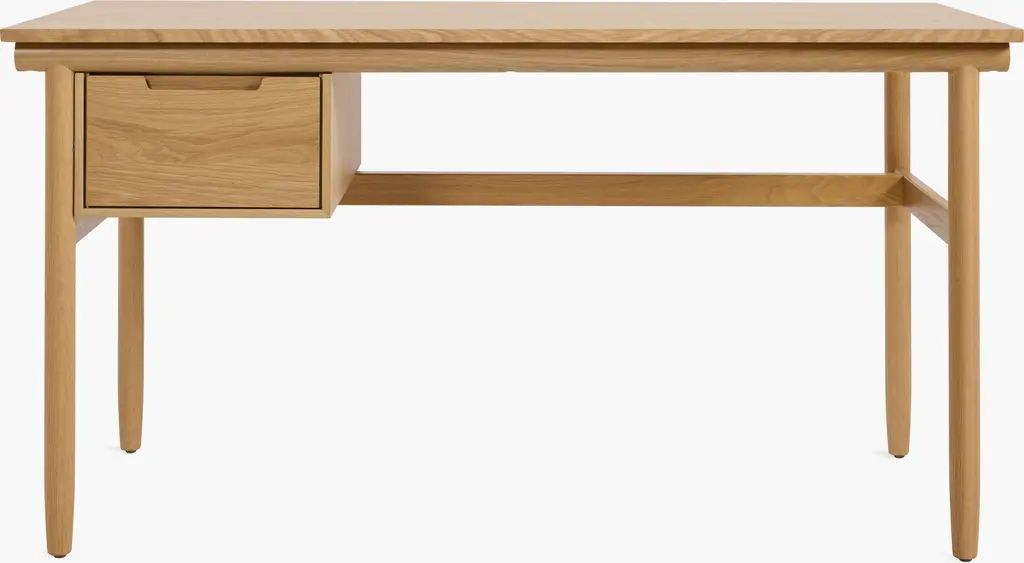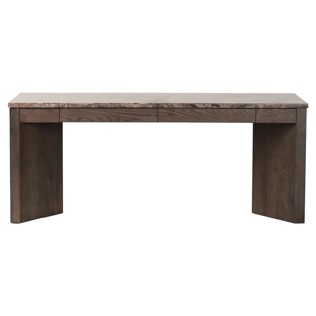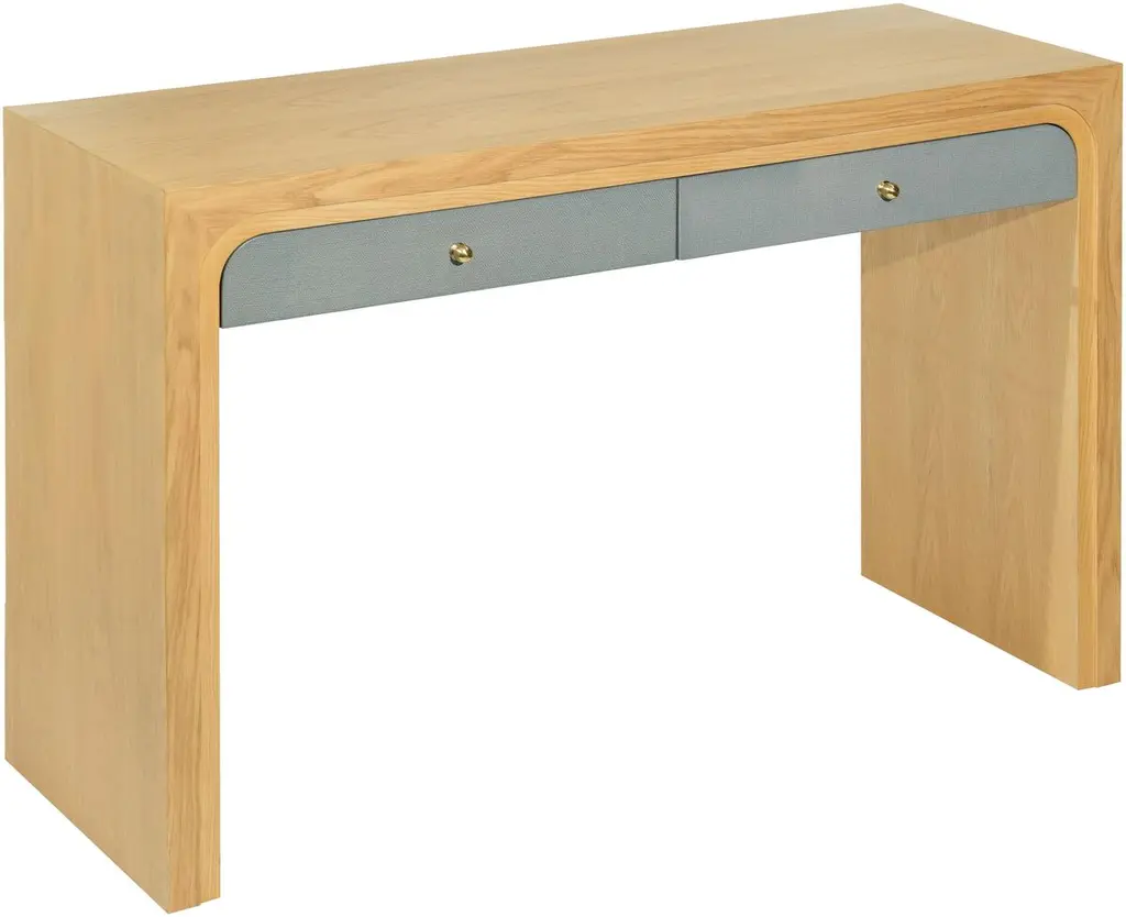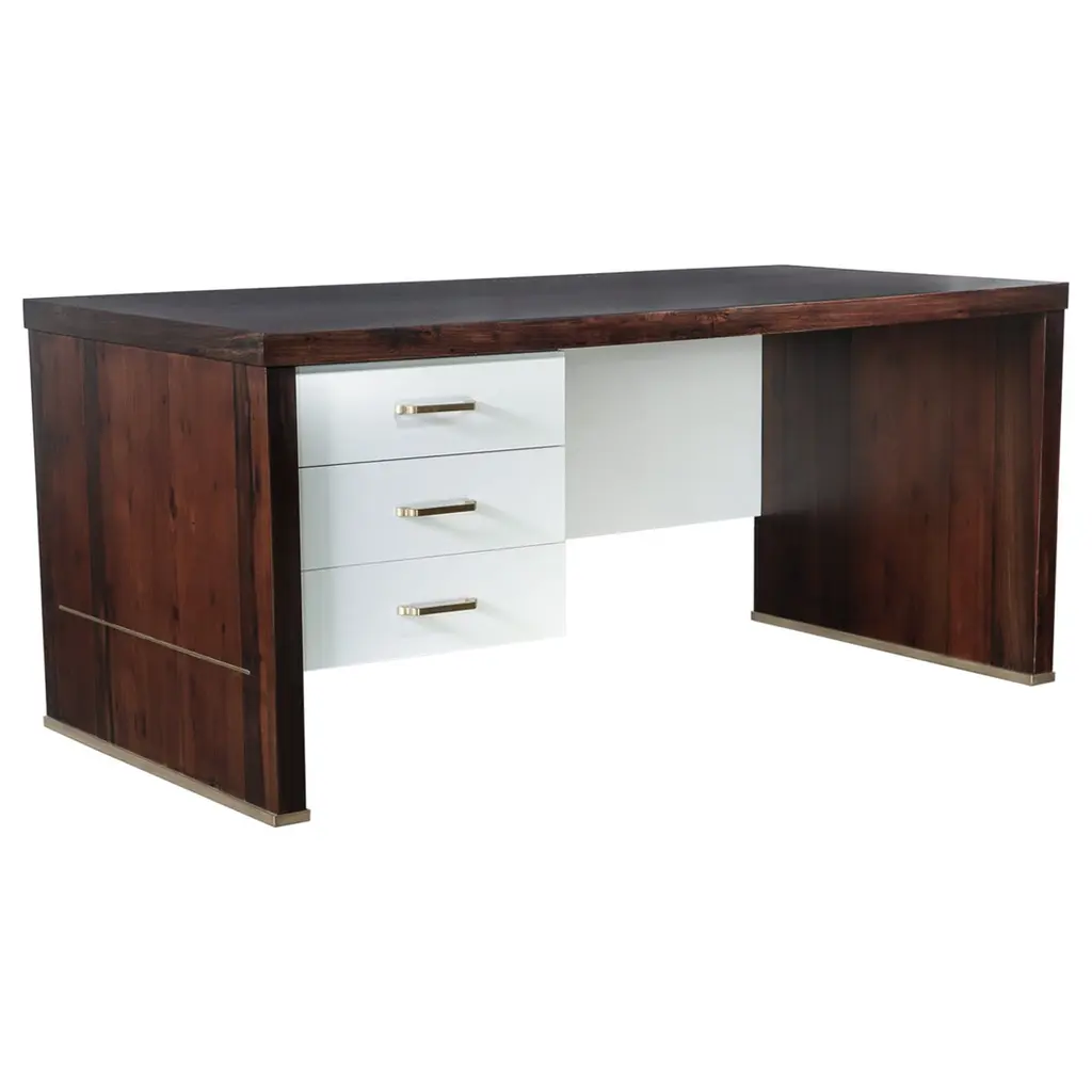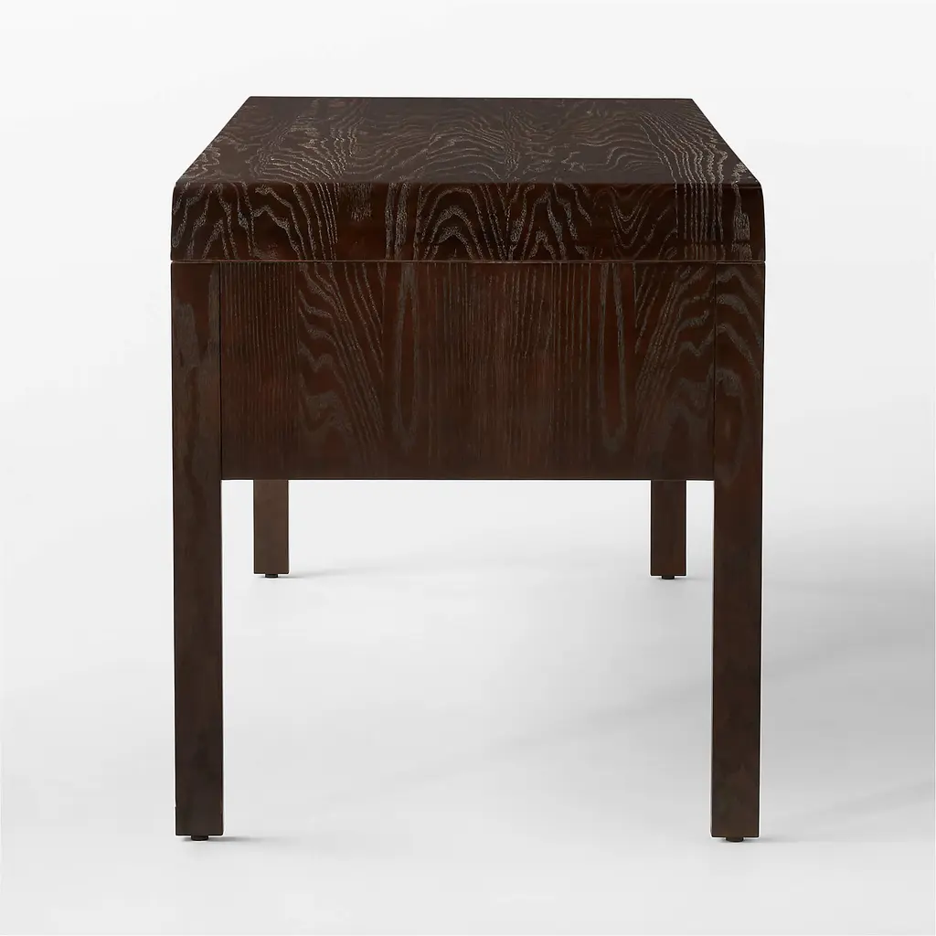 Executive-style desk marries a richly grained walnut finish with the warmth of honey-toned burl wood. Constructed with storage drawers on either side, it's finished with a spacious waterfall top for an understated mixed wood look. CB2 exclusive.