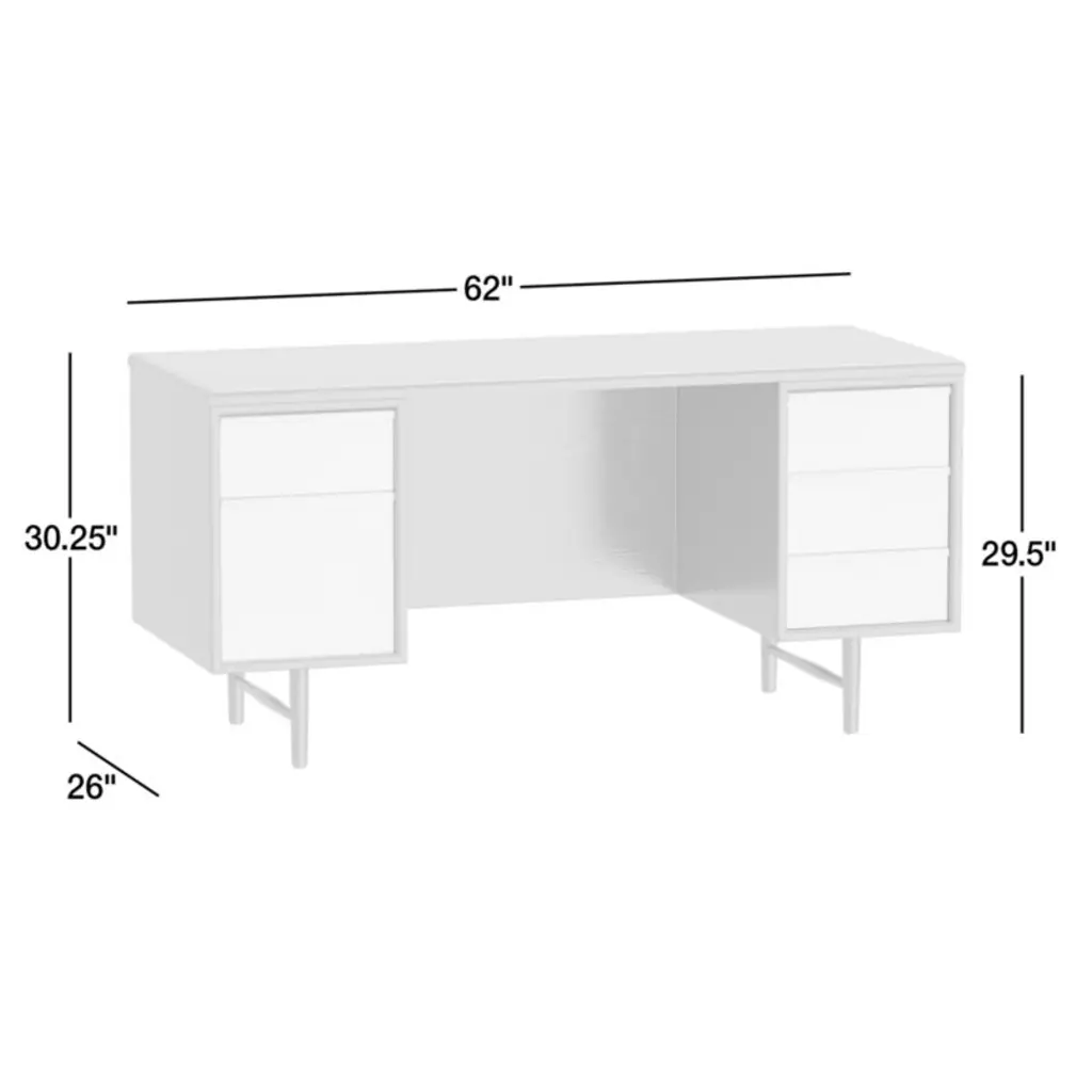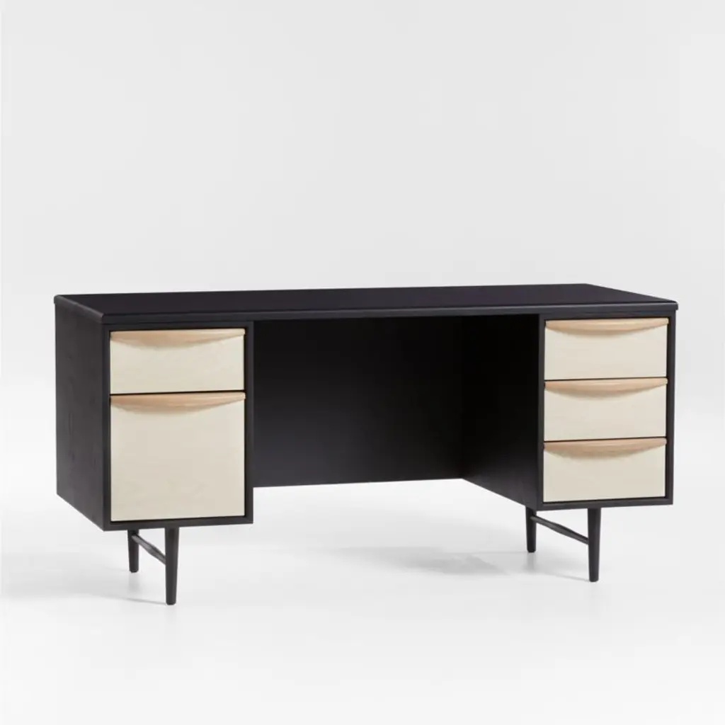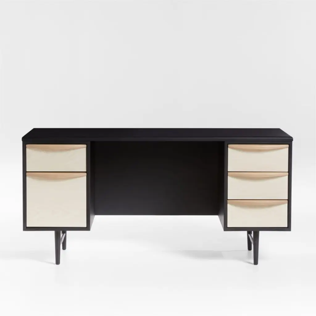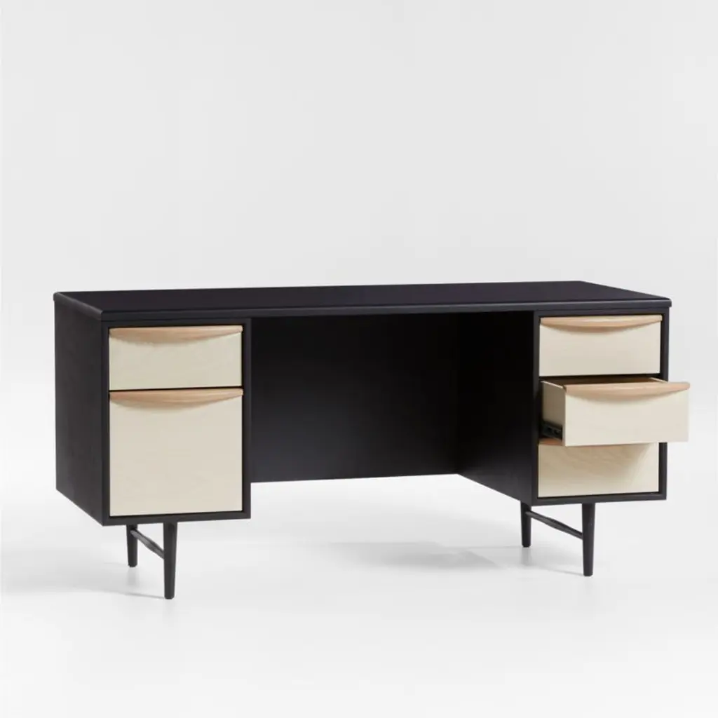 French modern meets Scandinavian mid-century in the stylish mix of our Kaufman desk. The combination of finishes on the ash desk adds graphic interestblack bringing the streamlined frame into sharp silhouette while whitewashed drawer fronts and natural pulls create contrast. We love the pillowed profile of the pulls that add subtle curves to the clean lines. Five drawers provide lots of storage, including one that accommodates letter and legal files. Fully finished, the desk is designed to float in the room for added versatility.