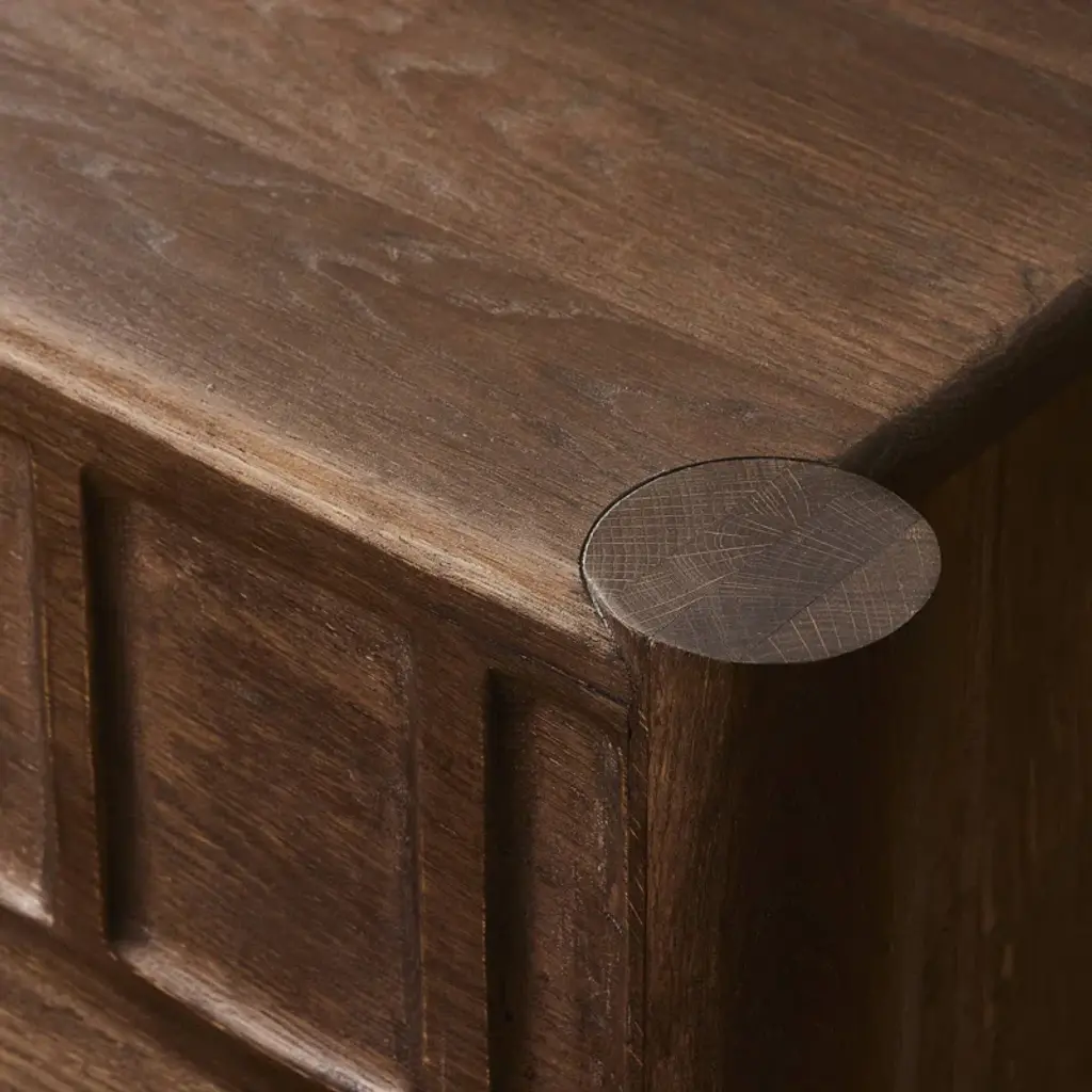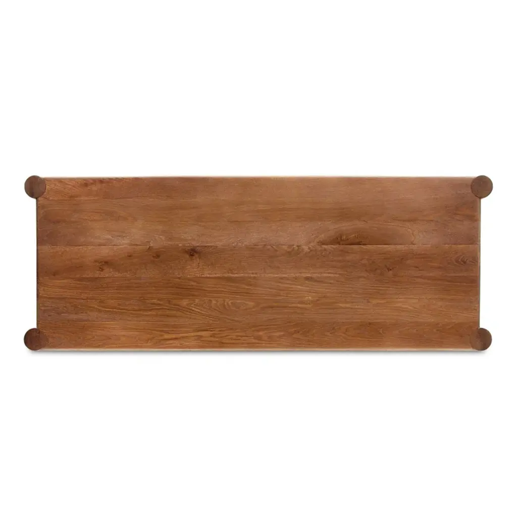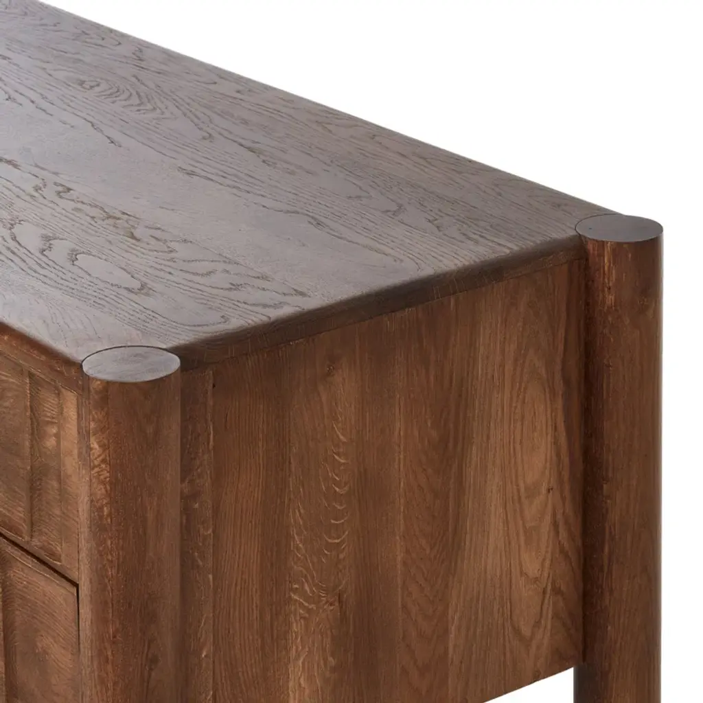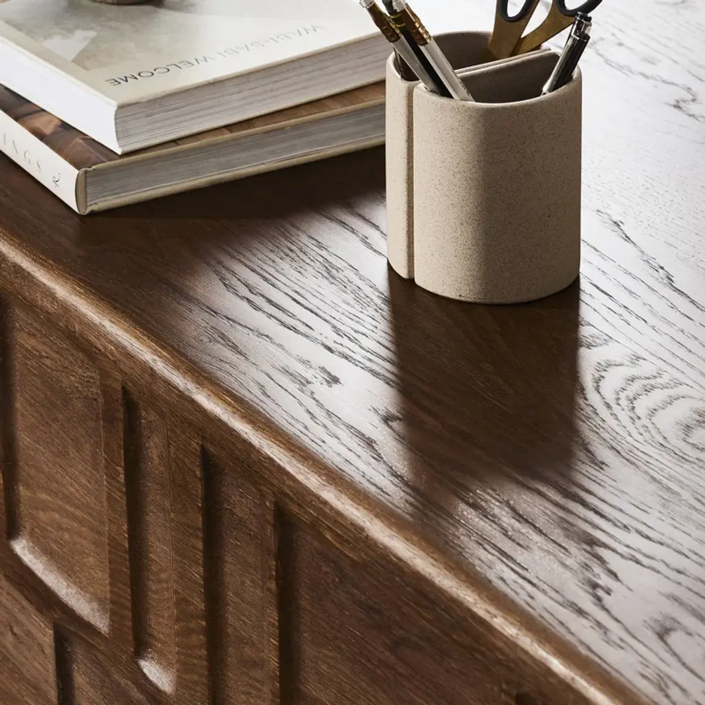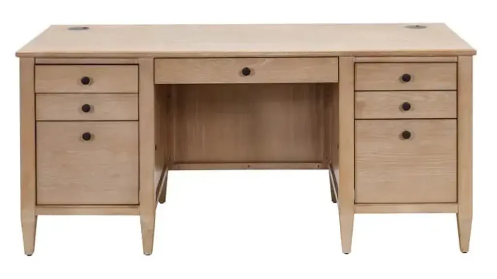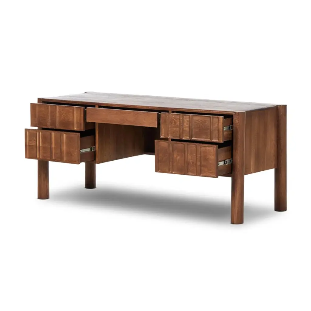 Grain and character variation within finish give this desk organic visual interest. Full-width carved panels on opposite sides add depth, while a sleek pencil drawer for easy storage. Floor-to-top cylinder legs give a primitive look that balances the movement of the wood pattern.