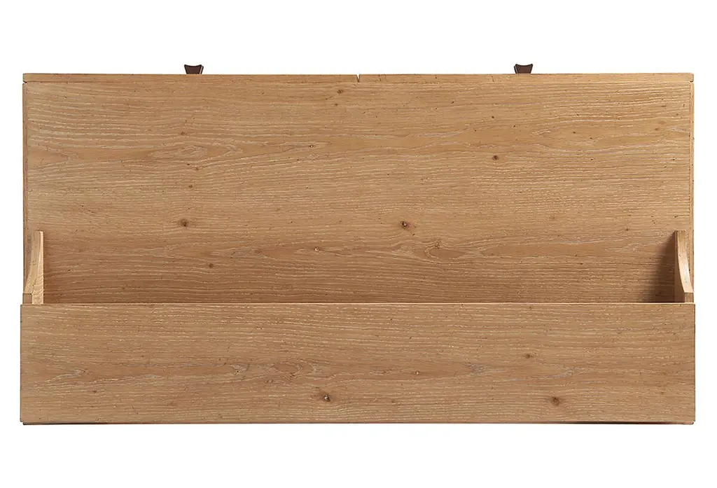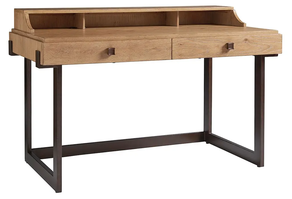 A clean-lined metal base in an aged bronze finish appears to cradle this writing desk's knotty oak top, which is fashioned with three open compartments and two self-closing drawers. A grommet for wire management is also included.