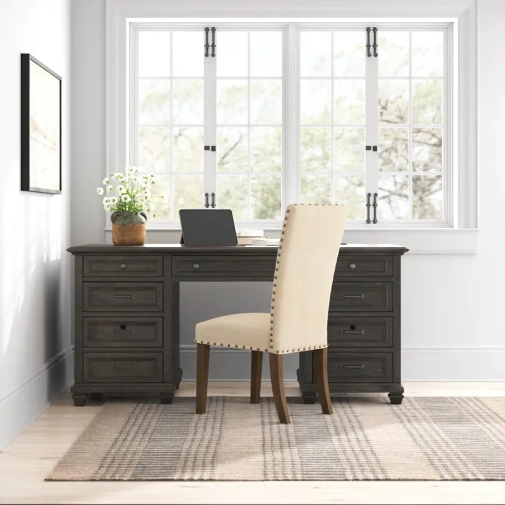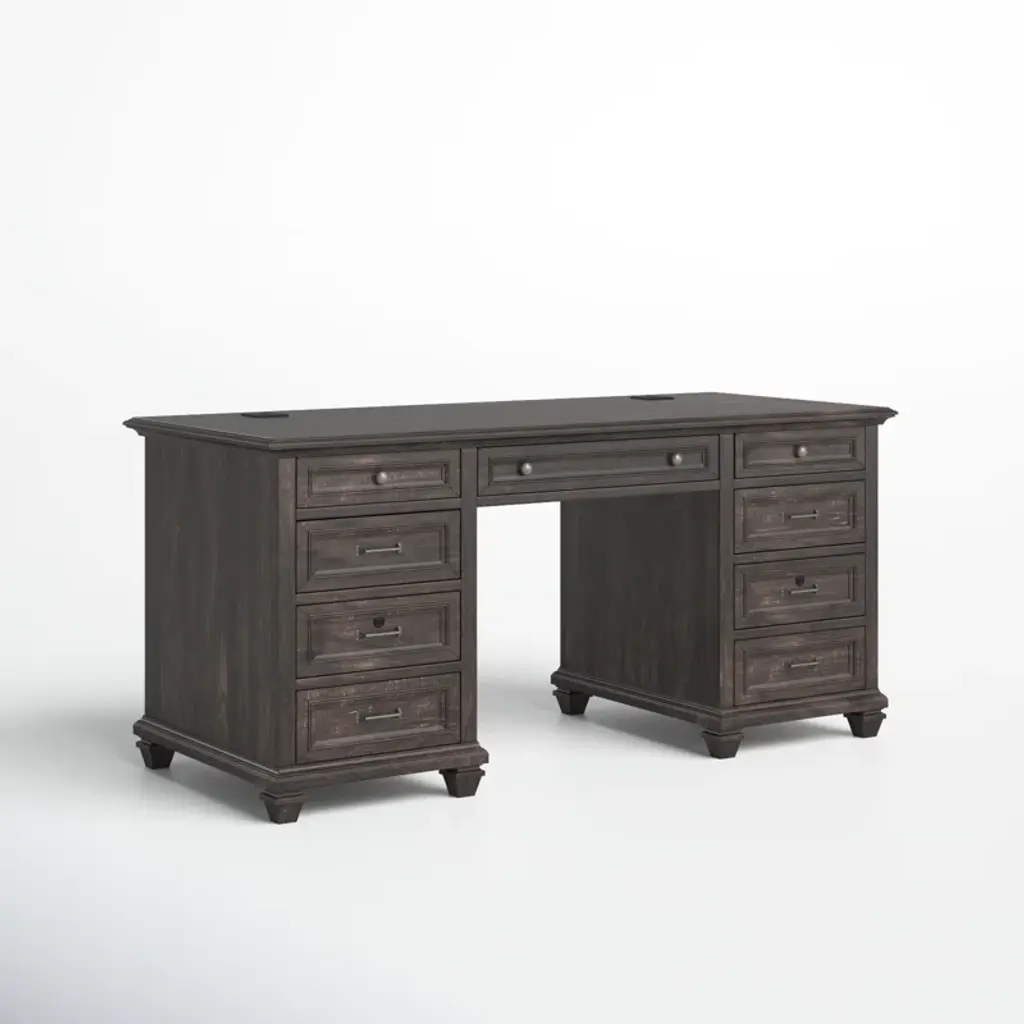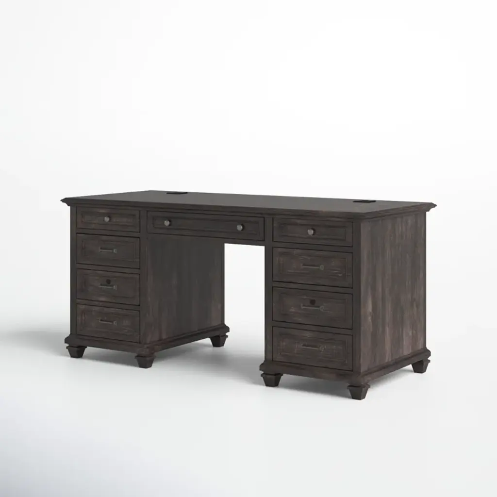 Elevate your home office with this executive desk, a perfect blend of form and function. Crafted from solid pine wood, it showcases a natural wood grain color variation and a touch of purposeful distressing for that rustic appeal. This desk offers ample storage with seven drawers, including a lockable filing drawer and a handy keyboard tray. Plus, the built-in electrical outlet and cable management system keep your workspace clutter-free. With a finished back, you can place this desk anywhere in the room, and enjoy a workspace that's as stylish as it is practical.