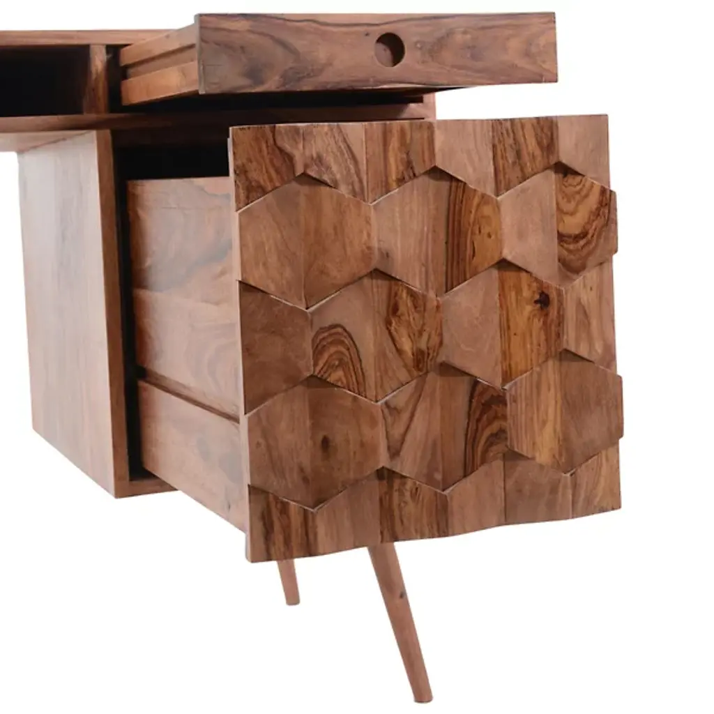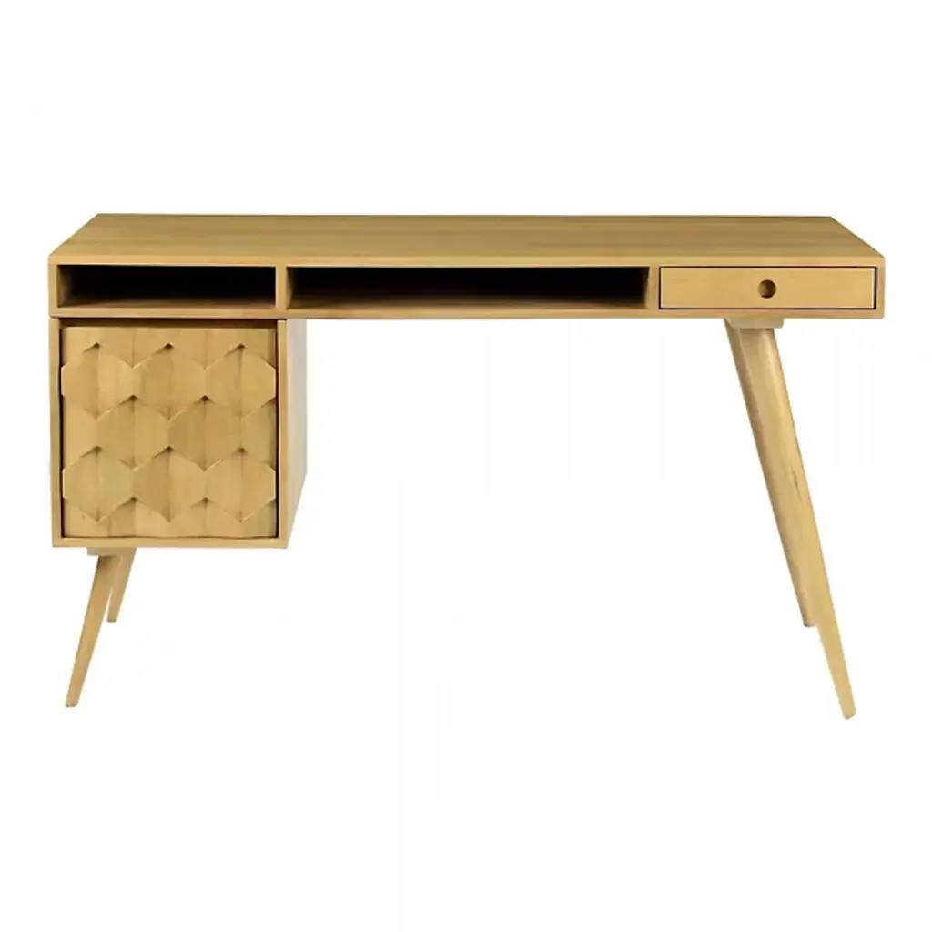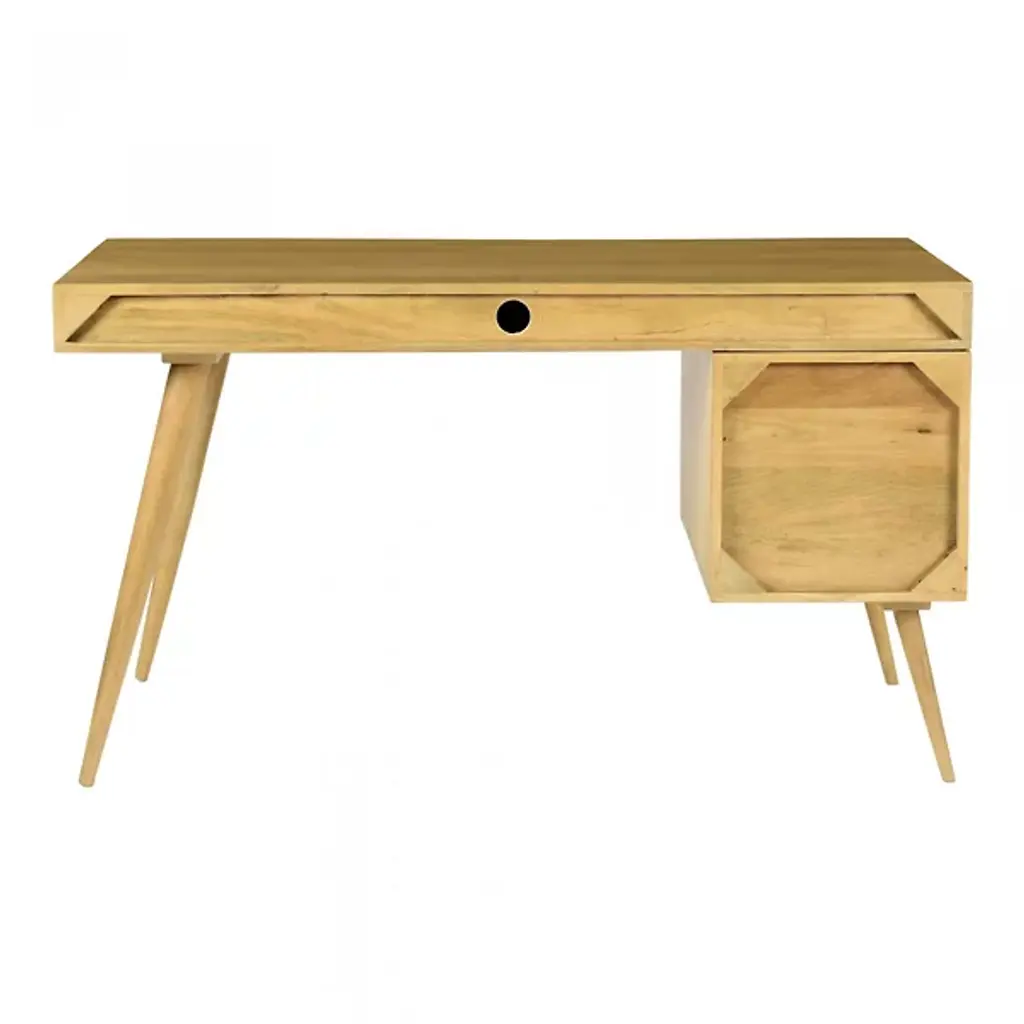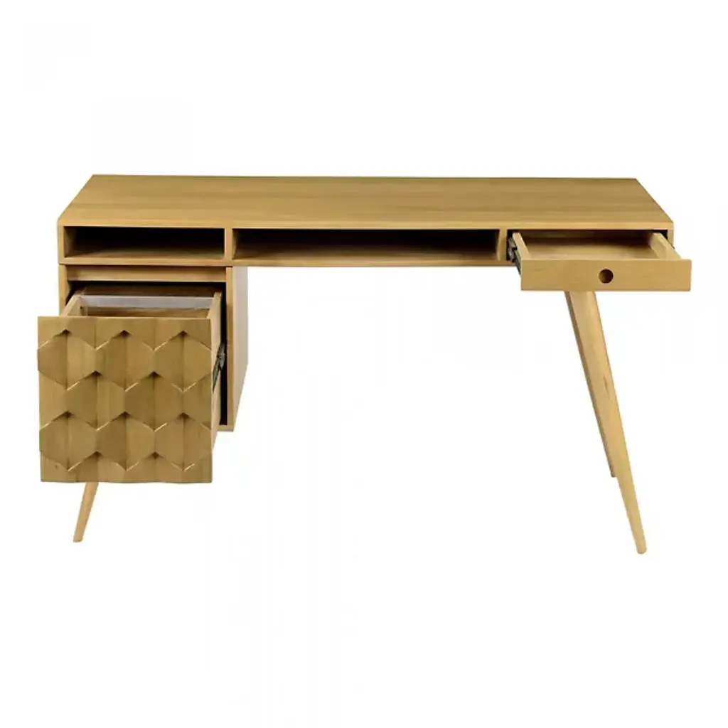 Current style influenced by another era. The Kim Desk by Huxe adds retro-inspired flair and efficiency to an office or living space. Clean lines, carved geometric shapes and tapered legs hint at mid-century modern style. For organized storage, it has an open shelf below the ample work surface plus stationery and file drawers. This contemporary furniture is solid Sheesham wood with an intricate grain and a natural finish for character and warmth.