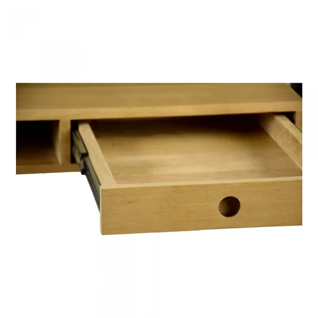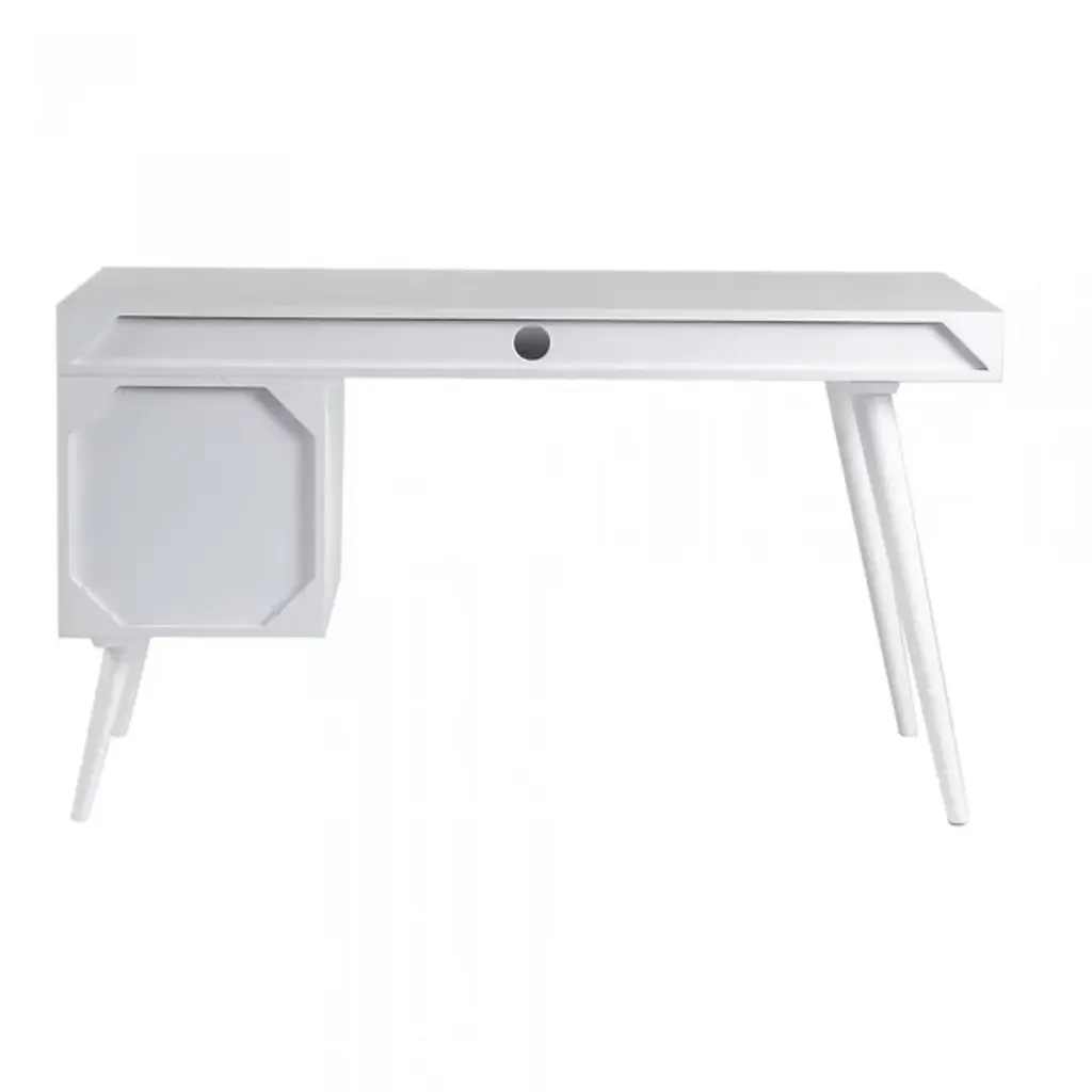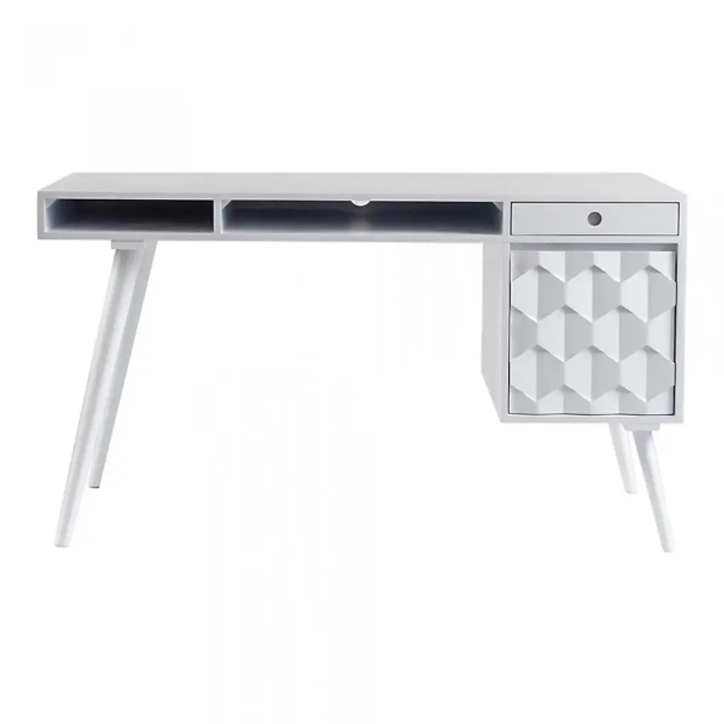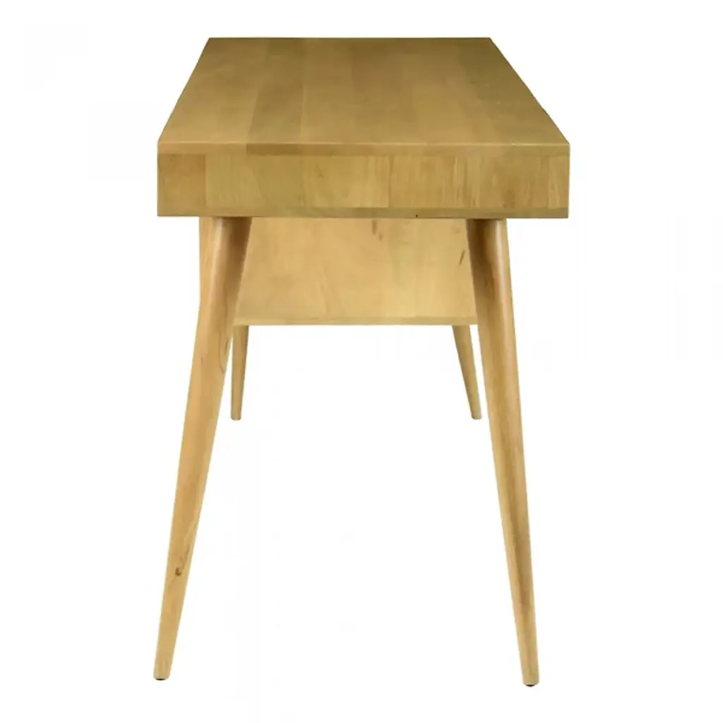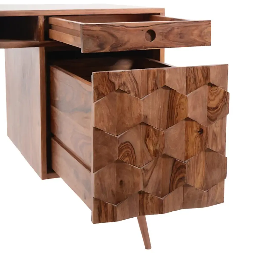 Current style influenced by another era. The Kim Desk by Huxe adds retro-inspired flair and efficiency to an office or living space. Clean lines, carved geometric shapes and tapered legs hint at mid-century modern style. For organized storage, it has an open shelf below the ample work surface plus stationery and file drawers. This contemporary furniture is solid Sheesham wood with an intricate grain and a natural finish for character and warmth.