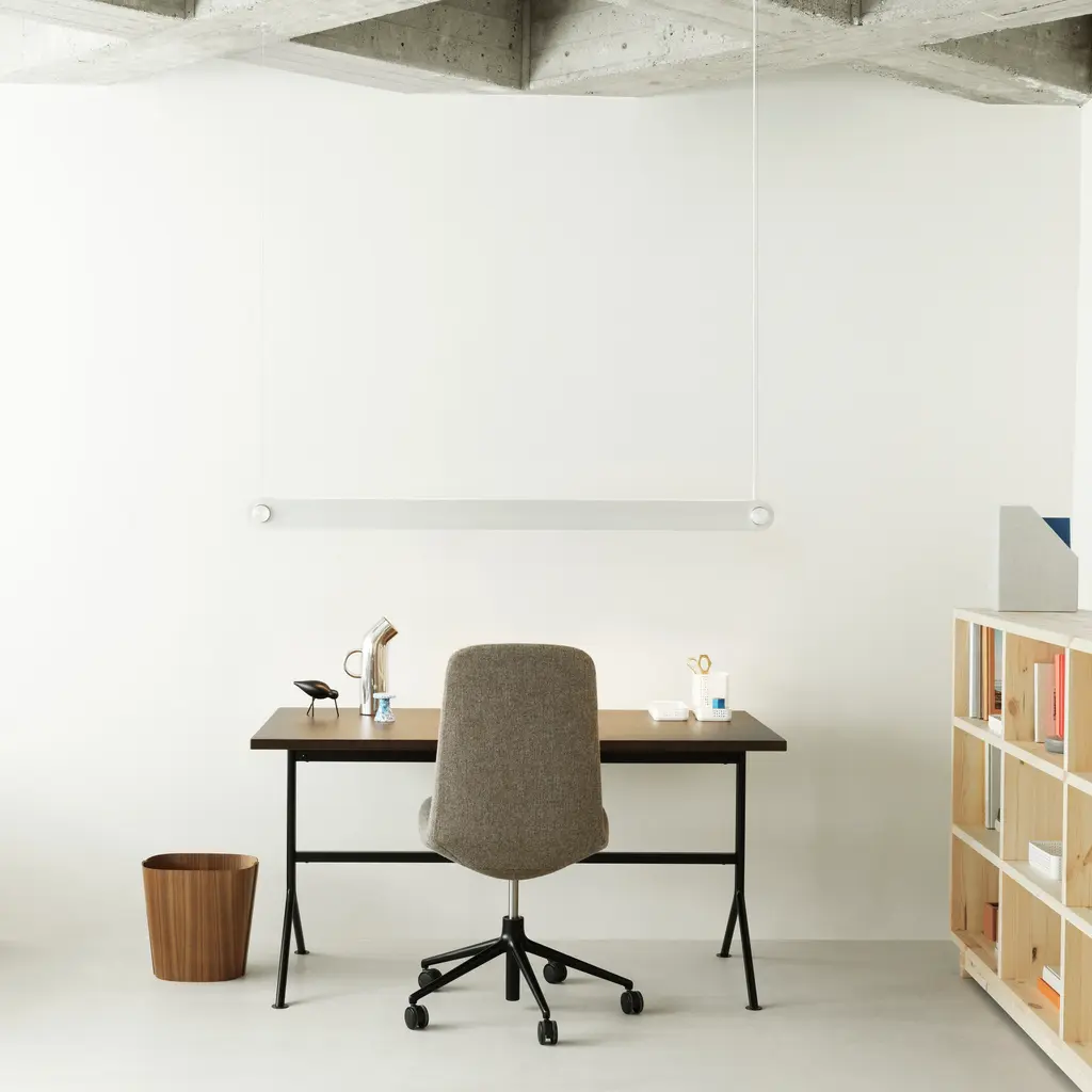 Characterized by a timeless trestle style, Kip updates the concept with a base in powder-coated steel and a top that comes in several complementary variants of solid wood. Coated with a practical, maintenance-free UV lacquer, the desk surface is crafted in pine or oak, with finishes to harmonize with home offices, kitchens or dressing areas.