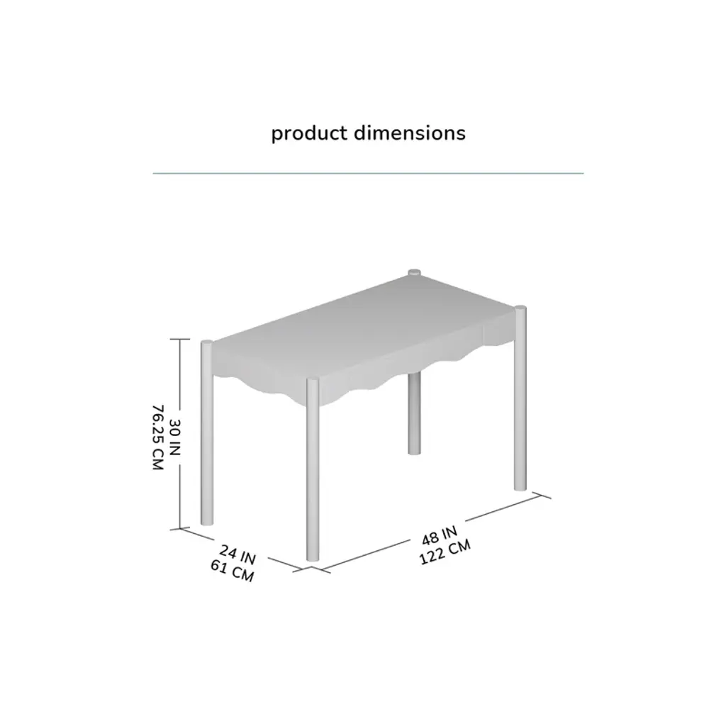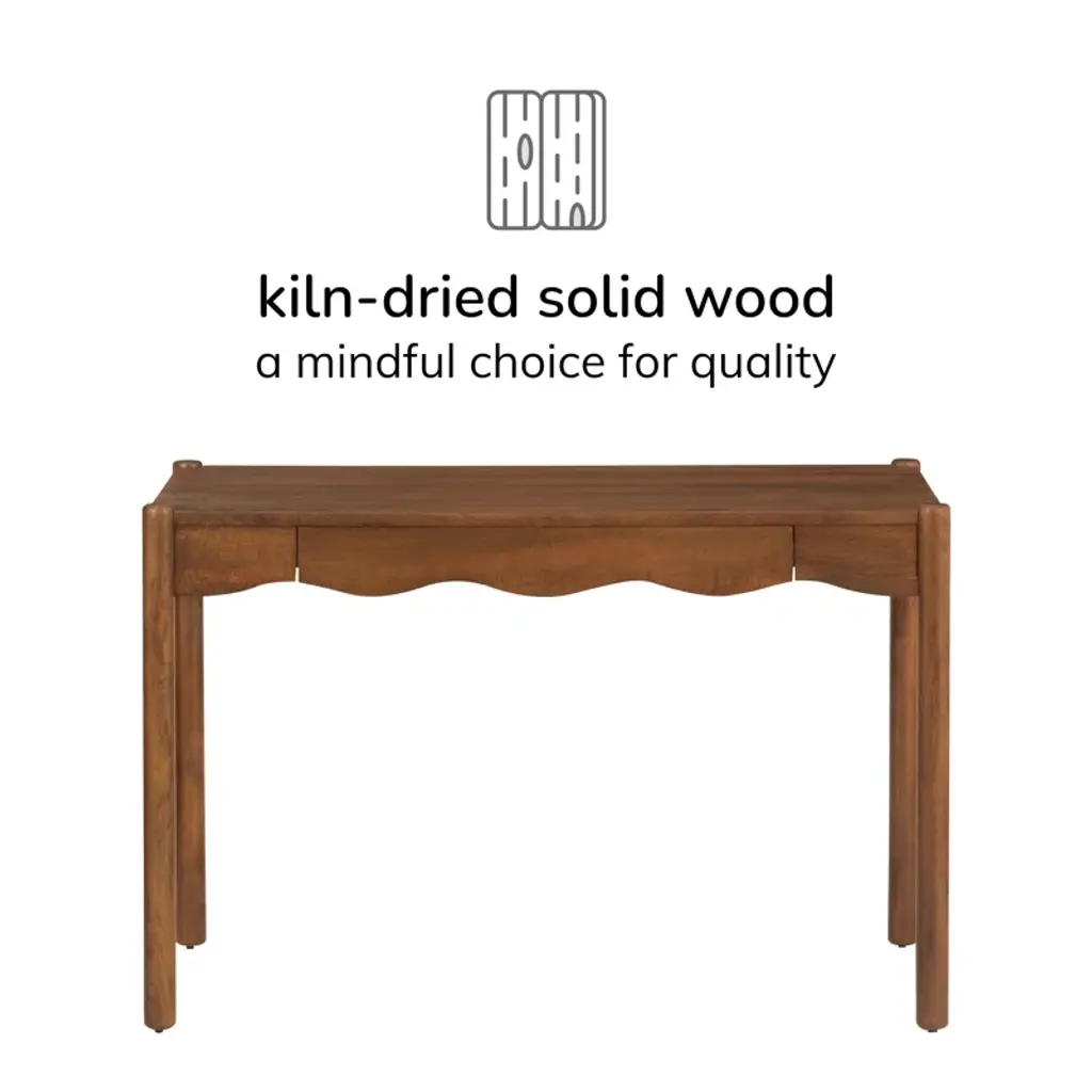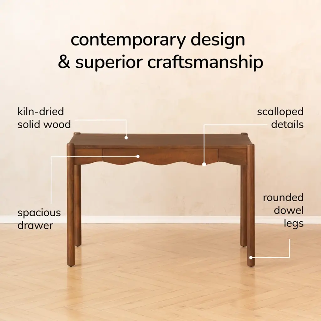 SCALLOPED SILHOUTTE A blend of elegant style & contemporary design - this desk is a design marvel! Featuring rectangular top with scalloped edges on front and sides, it comes with gracefully rounded dowel legs. The spacious tabletop offers ample space for your laptop and books while you can hide away your work essentials in the spacious drawer. Soft edges and clean clines, it assembles easily without any hassle!