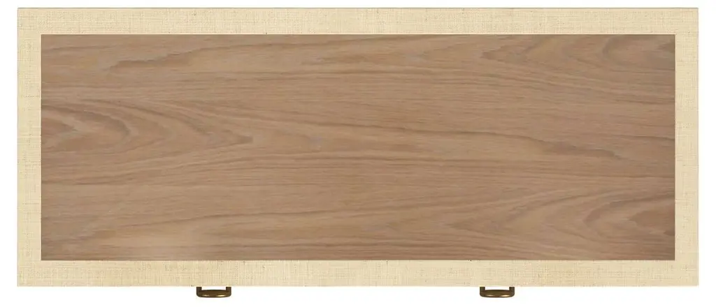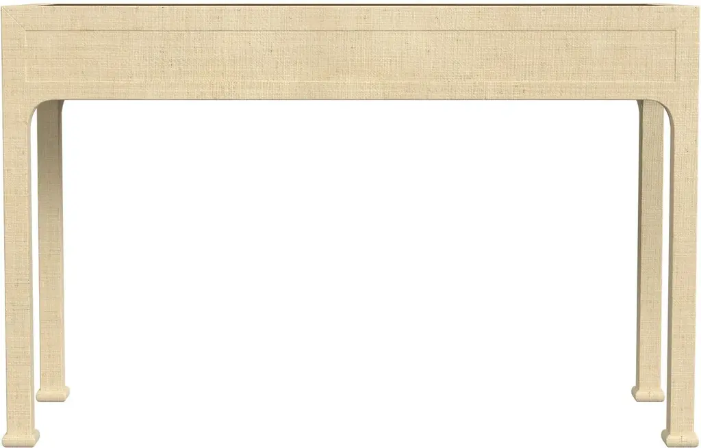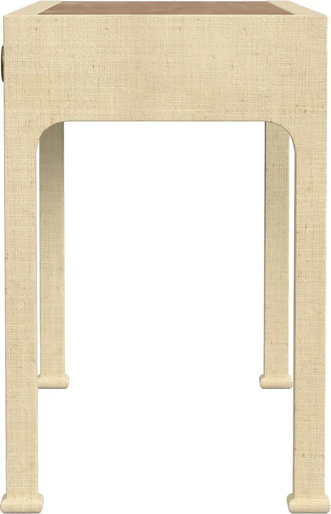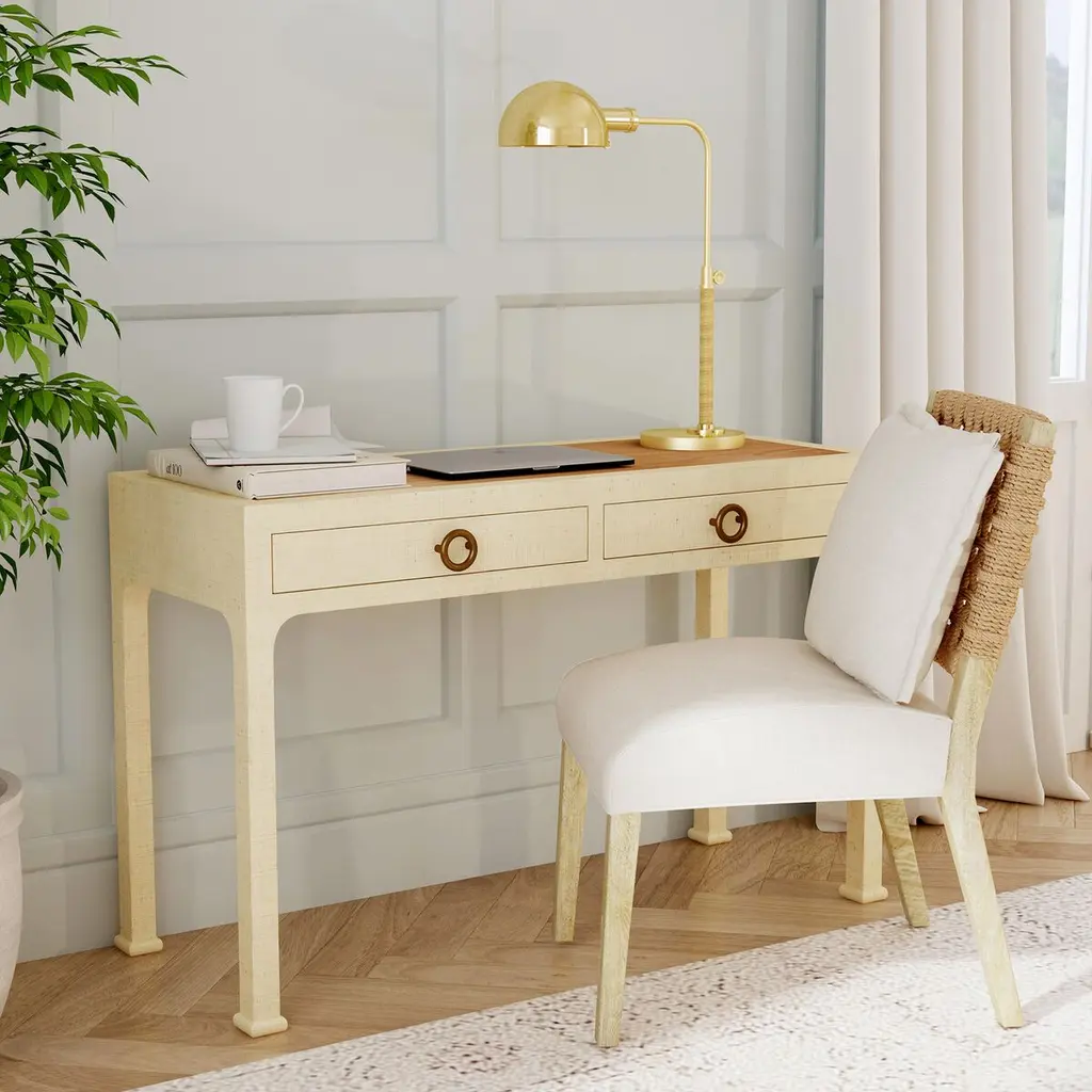 Designed by us and available only at One Kings Lane: This two-drawer desk pairs a smooth wood top with a frame covered in richly textured raffia. The rounded apron corners heighten the allure. Whether you use it in an office, as a sofa table, or in an entry, it will bring organic elegance to its surroundings.
