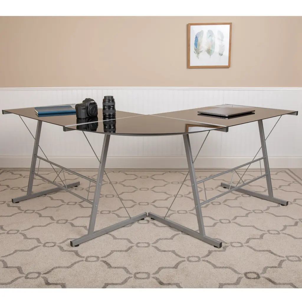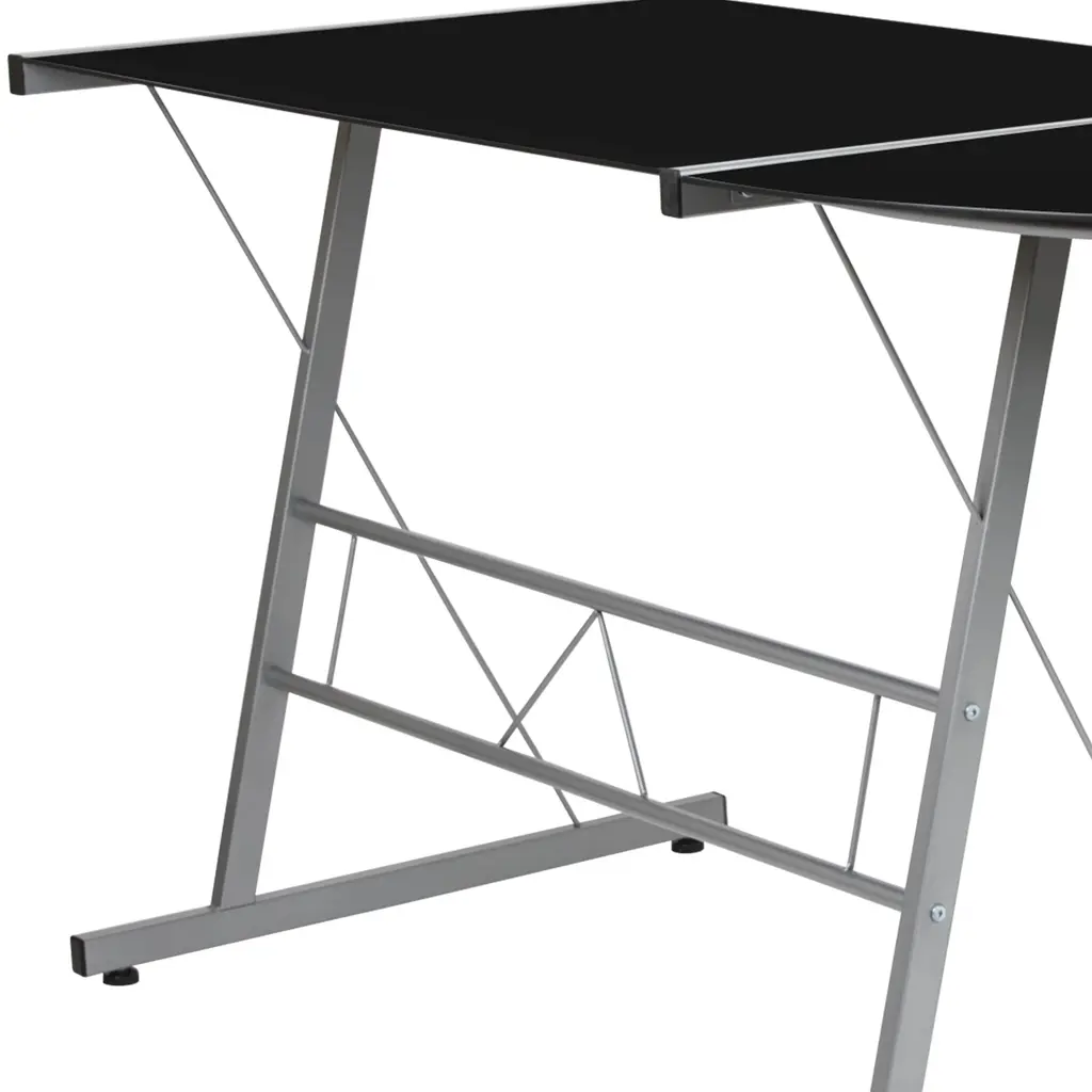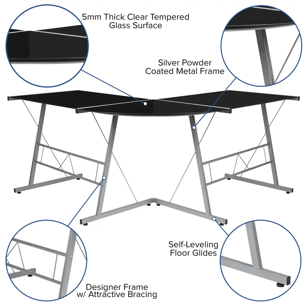 Whether the primary need for a desk in your home is work or play, this full L-shaped corner desk can handle it. The corner hugging design takes away the need for lots of floor space saving you priceless real estate. The corner connector (33.25"W x 23.5"D) will easily accommodate dual monitors leaving plenty of surface space for your accessories, gaming console and controllers, laptop and other necessities. This contemporary home computer desk has a tempered glass top (Glass Desks (2): 35.5"W x 23.5"D x 29"H) that sits atop an open silver powder coated frame that holds up to 110 lbs. and gives you generous leg room and ample space for a CPU. Place this corner computer gaming desk on either corner of a room or if space isn't an issue, come off the wall to add an open concept feel and dual side access. Self-leveling floor glides will ensure your platform stays stable. Quick assembly and easy cleaning make this glass computer desk an ideal choice for your home office, teen's bedroom or your family room.