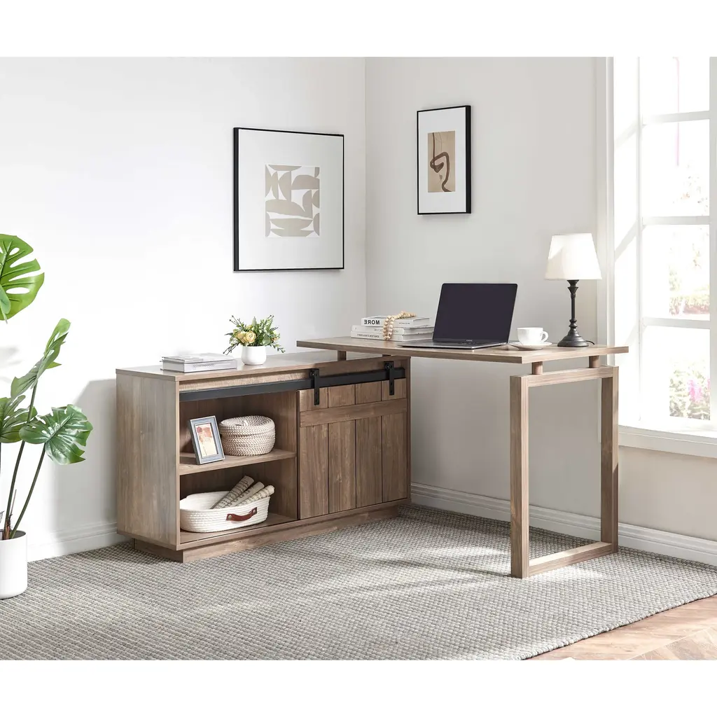 L-shaped Tabletop with attached storage Credenza; Storage Credenza features a single sliding barn door with metal gliding hardware that hides clutter; Credenza return has two divided shelves for organization and return is reversible to left and right side of table, finished on the back; Table top workspace is 47.25"W x 23.25"D