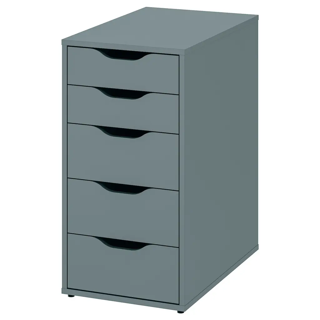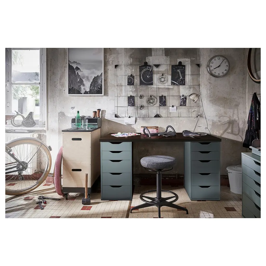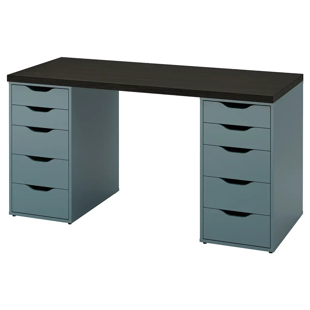 LAGKAPTEN / ALEX Desk - black-brown/gray-turquoise 55 1/8x23 5/8 ". The table top is made of board-on-frame, a strong and lightweight material. The cut-out handles not only add character to the drawer units, they also make it easy for you to grip and open the drawers.