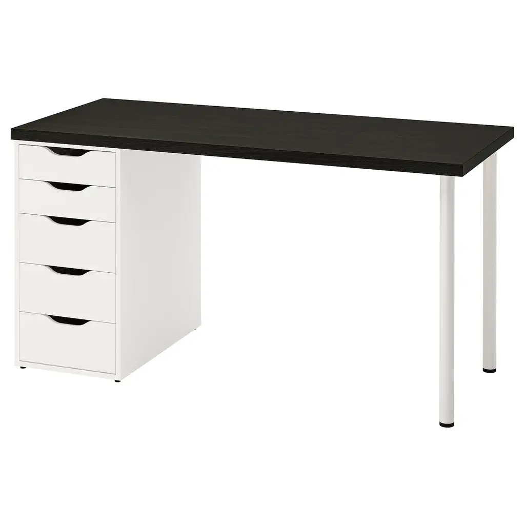 LAGKAPTEN / ALEX Desk - black-brown/white 55 1/8x23 5/8 ". The table top is made of board-on-frame, a strong and lightweight material. Pre-drilled holes in the table top make it easier to attach the legs. Possible to separate for recycling or energy recovery if available in your community.