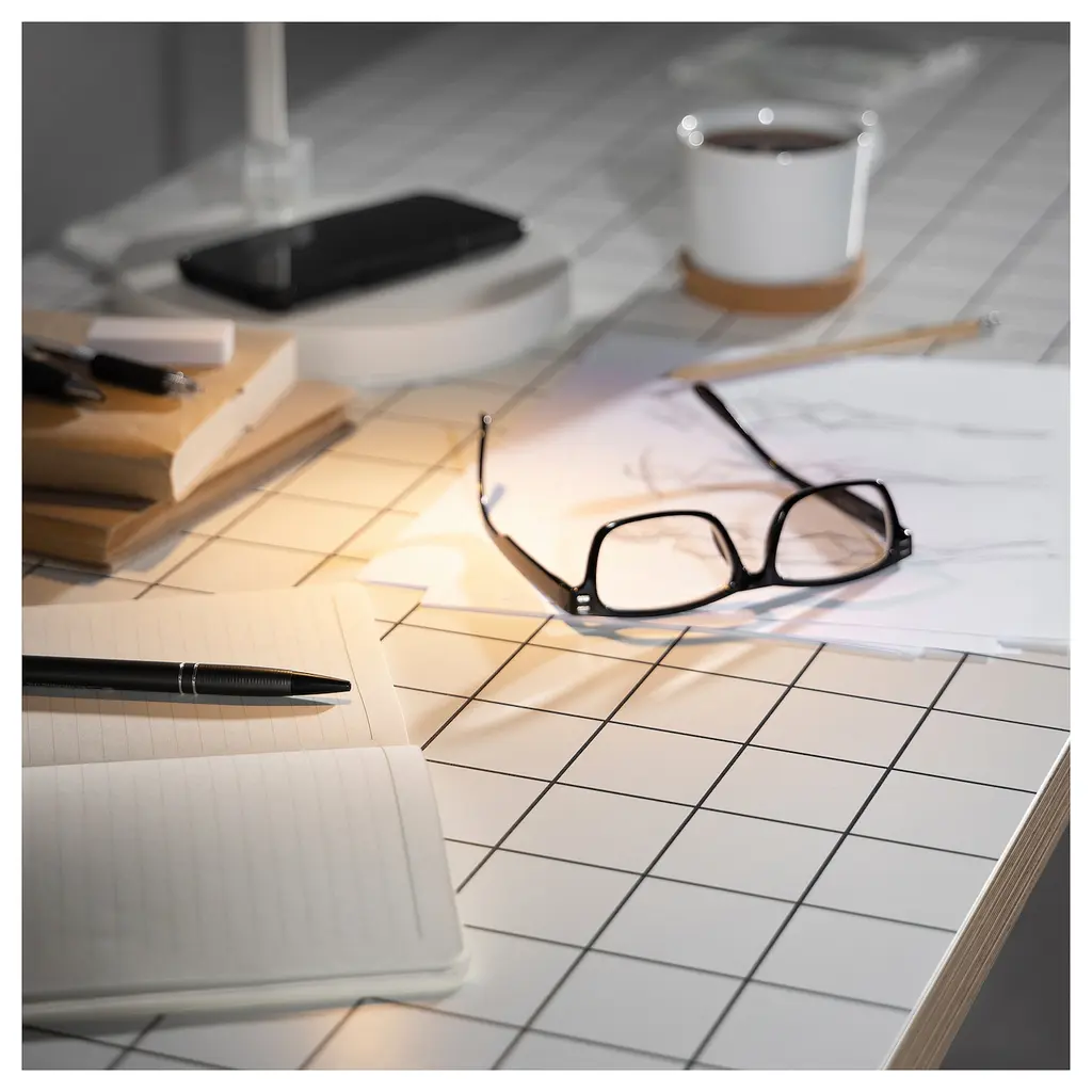 LAGKAPTEN / OLOV Desk - white anthracite/black 55 1/8x23 5/8 ". The tabletop has pre-drilled holes to make it easier to attach to the underframe. The plywood-patterned edge band adds to the quality feel.