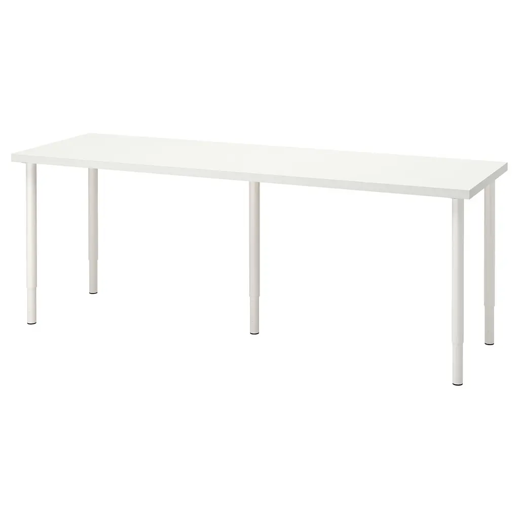 LAGKAPTEN / OLOV Desk - white 78 3/4x23 5/8 ". The tabletop has pre-drilled holes to make it easier to attach to the underframe. Product is possible to recycle or use for energy recovery, if available in your community. For table tops with lengths 79 in, an extra leg is needed for stability.