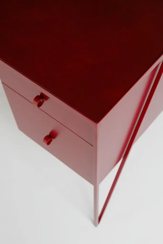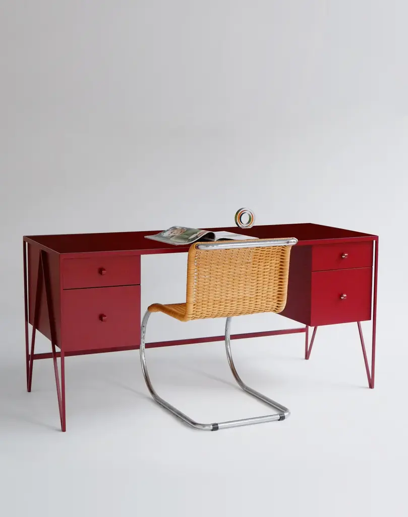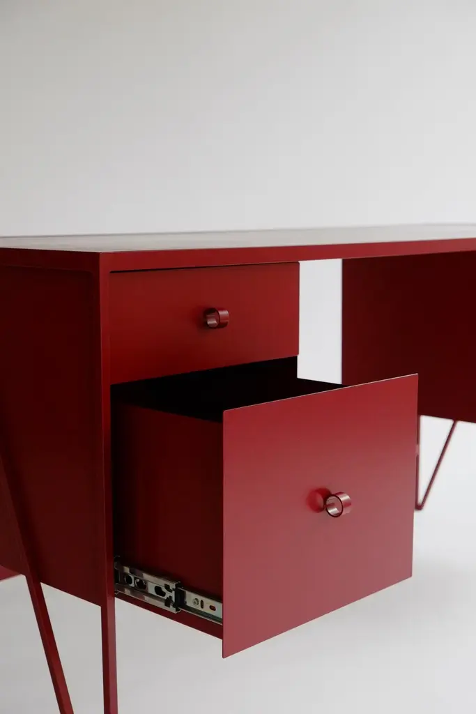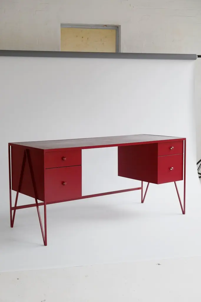 This large burgandy color study desk is made with a powder coated steel frame and a beautiful natural linoleum top made out of linseed oil. This modern minimal desk has four steel drawers suspended underneath the tabletop and Loop handles for pulls. The deep red study desk looks great against both period details and in modern surroundings. Measurements: 152 cm long, 60 cm deep, 74 cm high with four drawers.Colour samples available to order from our storefront - LU2894331610202 Customizable - can be made to any size, with two drawers or without drawers. Available in fifteen powder coated colors for the steel and 20 different color options for the tops.Made to order - lead time eight weeks.All &New products are made to order in Britain. They have plenty of character as every weld is different. The result is a collection of furniture that celebrates those little imperfections that make objects beautiful.Mirka & Jo&New, Modern British Furniture.Study desk/ Community registered design number: 002391839-0001.