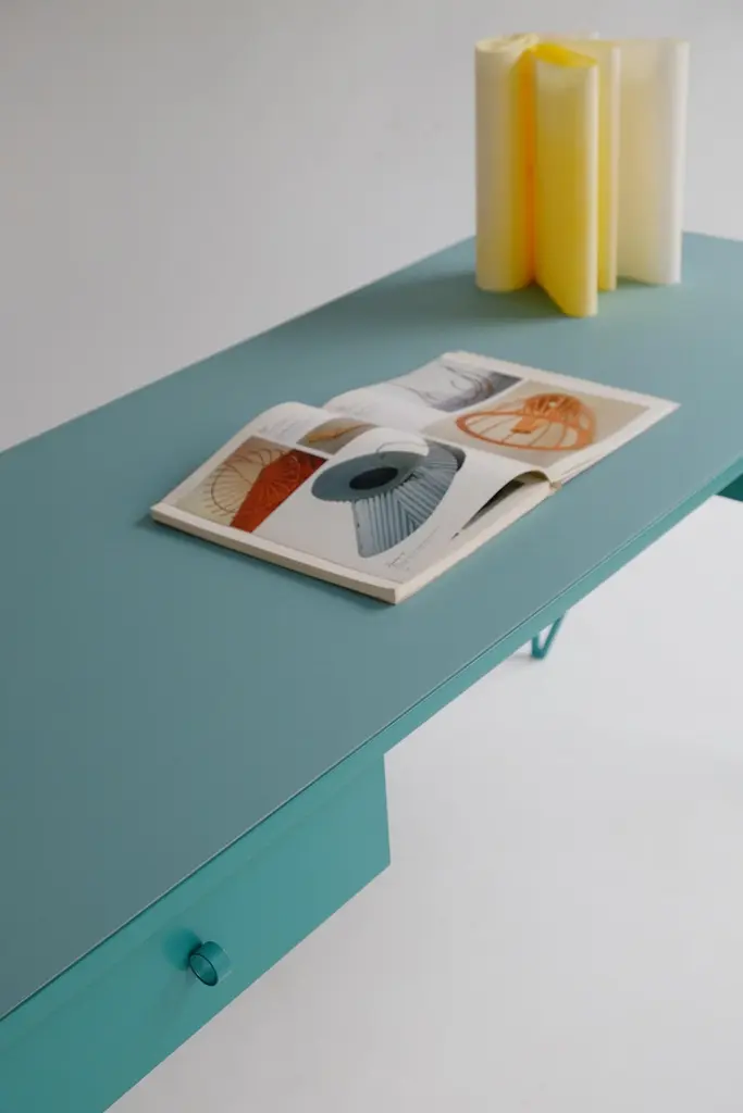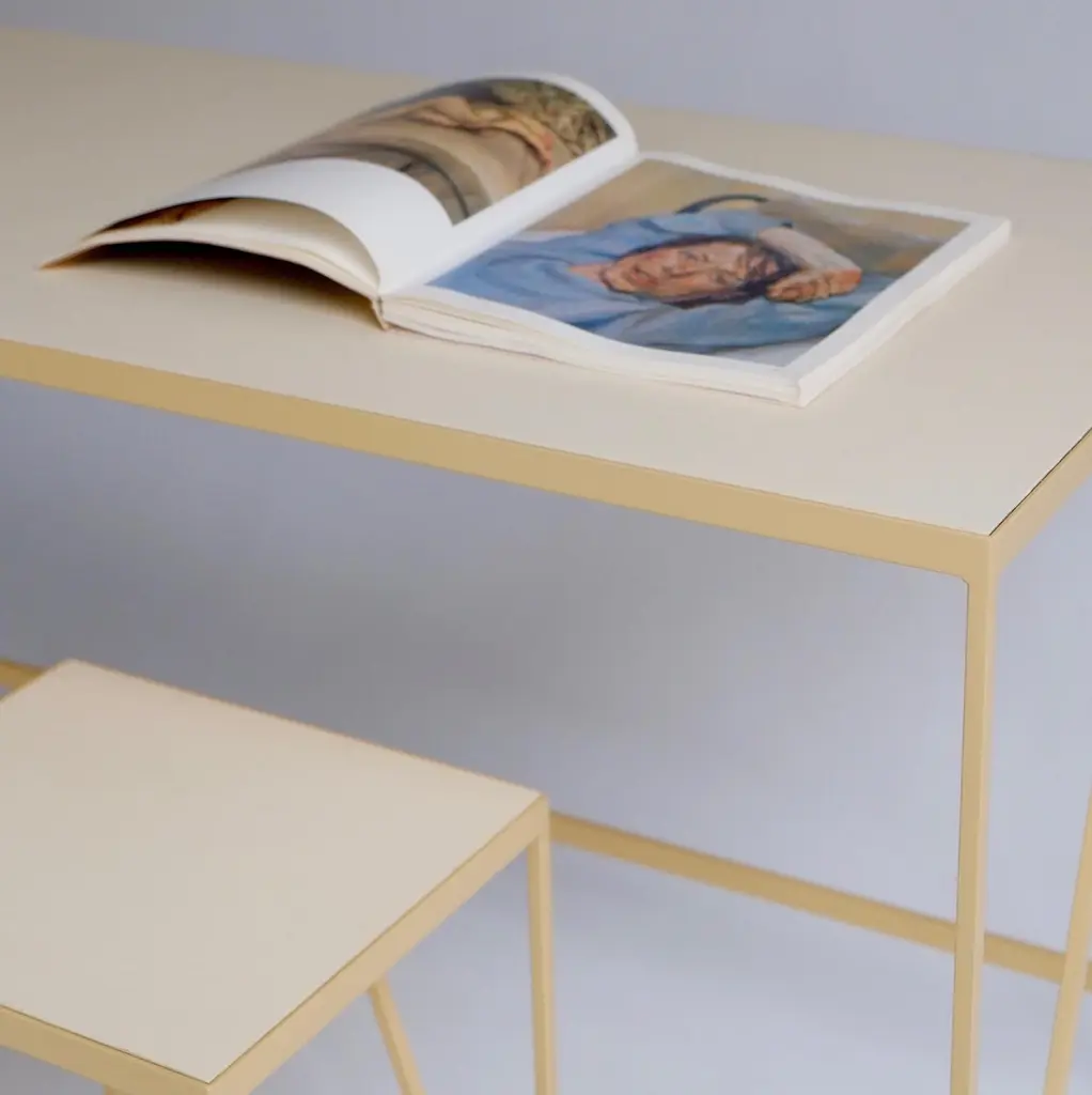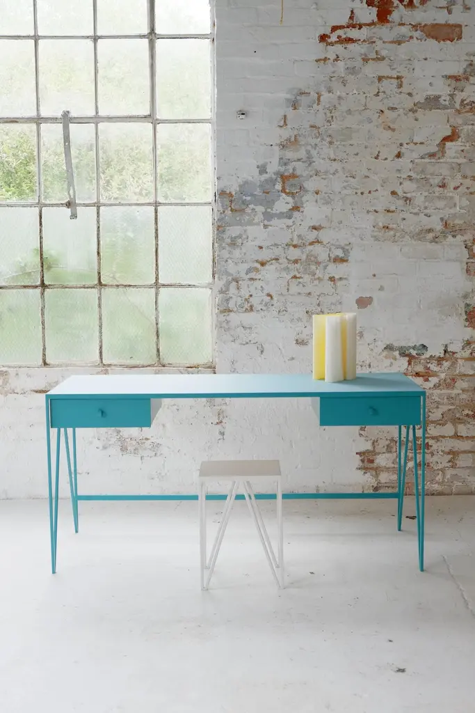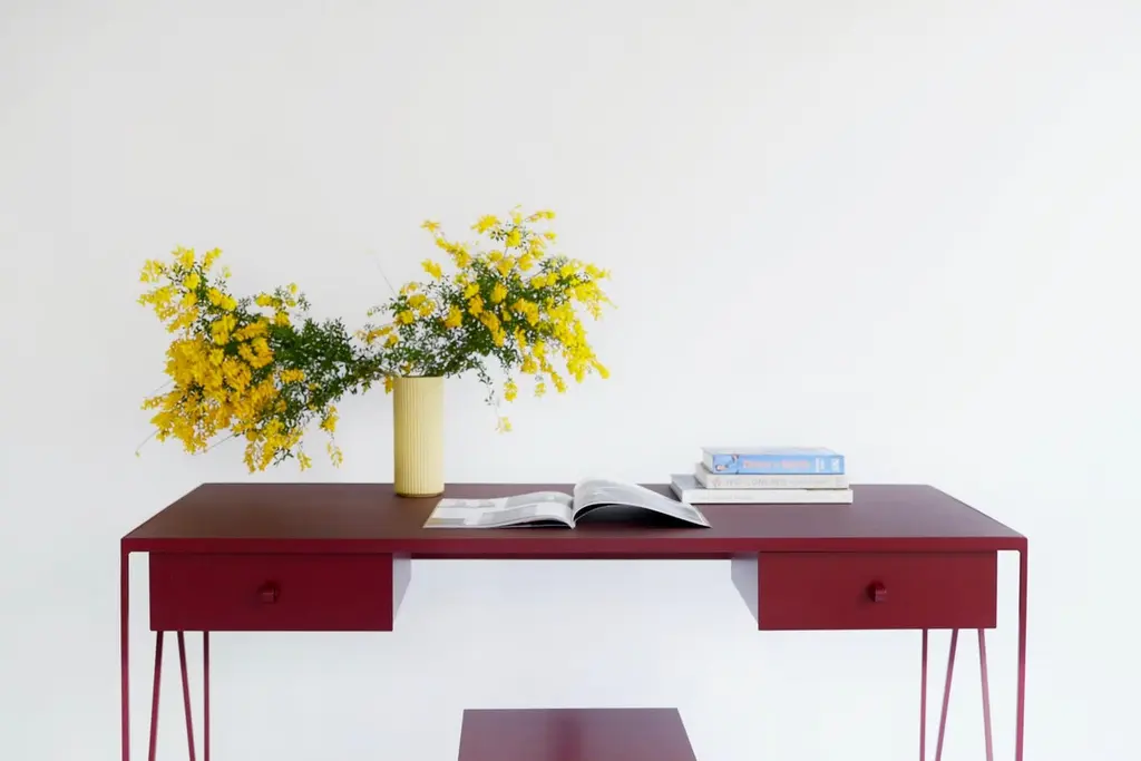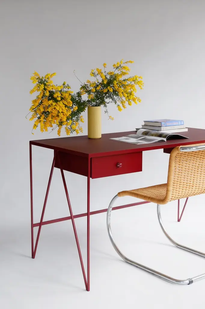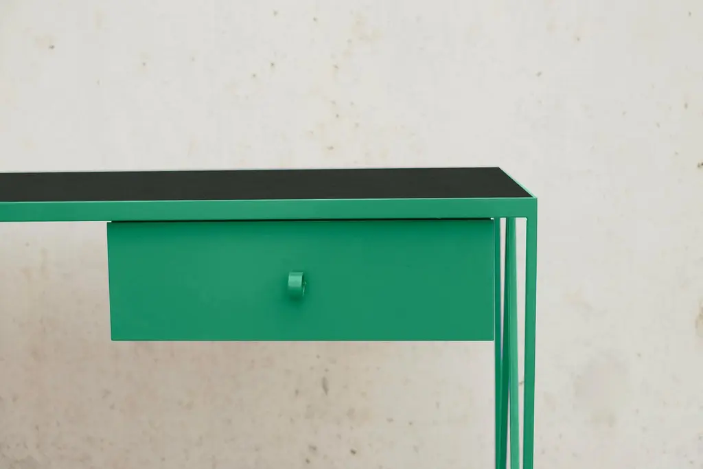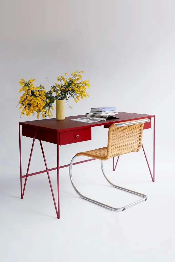 This large beetroot color study desk is made with a powder coated steel frame and a beautiful natural linoleum top made out of linseed oil. This modern minimal desk has two steel drawers suspended underneath the tabletop with our Loop handles. The deep red study desk looks great against both period details and in modern surroundings. Available in fifteen powder coated colors for the steel and a range of options for the tops. Made in England. Colour samples available to order from our storefront - LU2894331610202 Measurements: 152 cm long, 60 cm deep, 74 cm high. Bespoke sizes available.Mirka & Jo&New, Modern British Furniture.Study desk/ community registered design number: 002391839-0001.