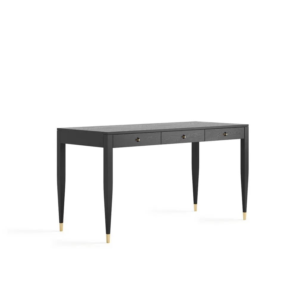 Desk in mid-century style with three drawers and brass handles. The tapered legs are finished with brass plated aluminum feet. Desk made of solid oak walnut wood and wood covered with natural oak veneer. Other wood on request. Perfect as office desk, study desk, computer desk.Handmade in Poland.Materials:-drawer fronts, sides, dividers, back: solid oak-drawer body: solid oak-legs: solid oak-top: blockboard overlaid with oak veneer-handles: solid brass-feet: brass plated aluminum-matte black varnishDimensions:width: 160 cm (63")depth: 70 cm (27,5")height: 75 cm (29,5")Also available in 140cm x 60cm version.You can change the size, material, surface treatment after prior contact and setting prices.