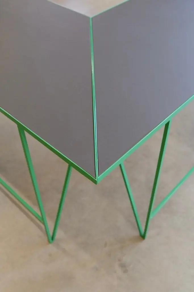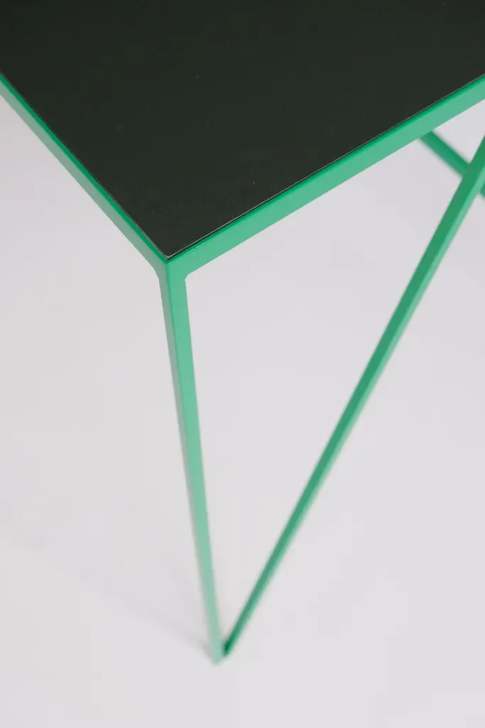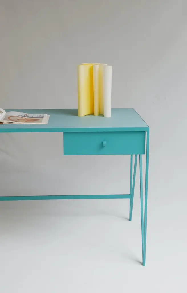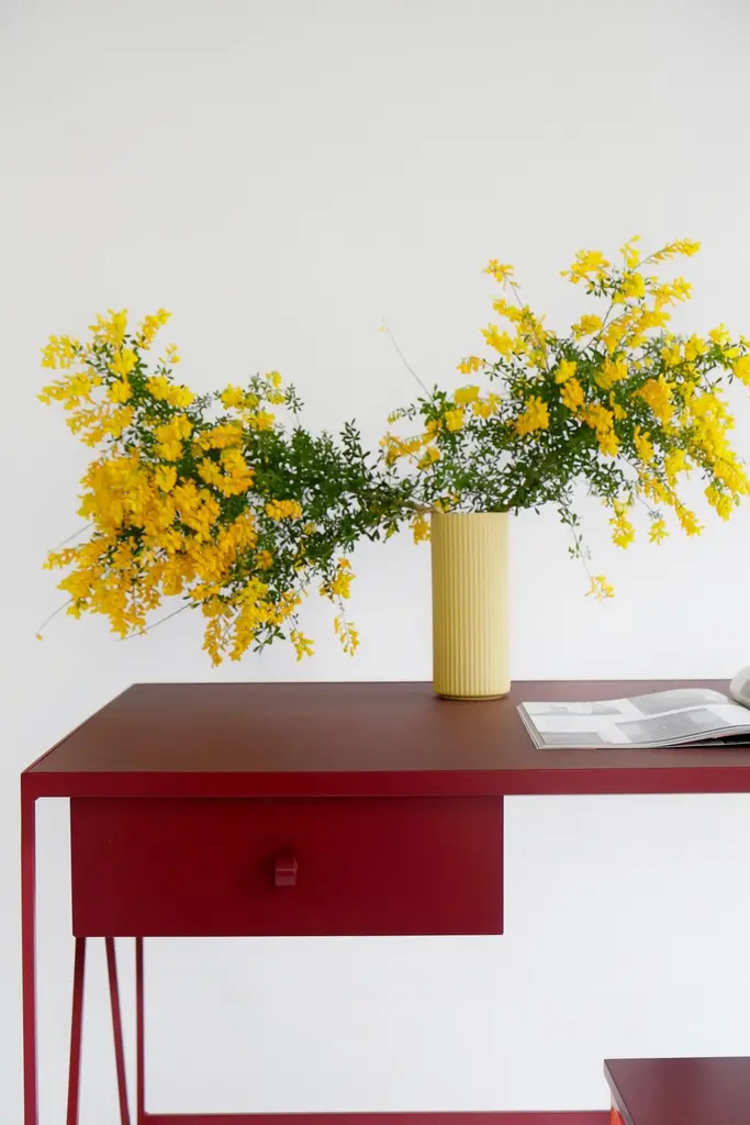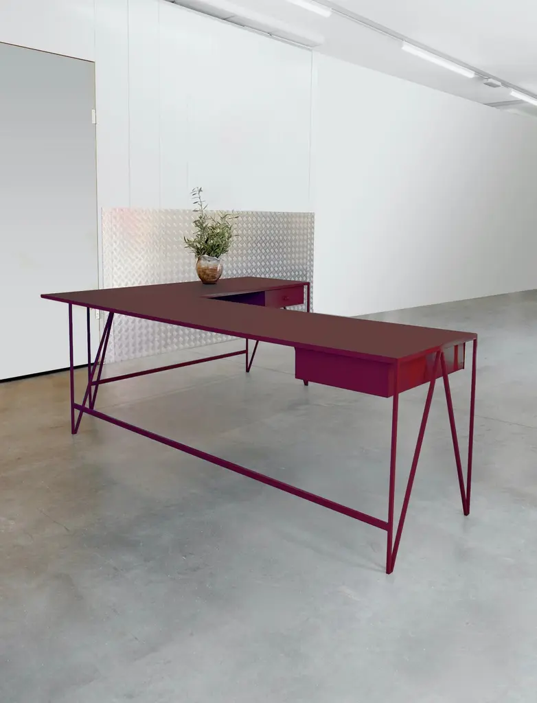 A beautiful large L Shaped Study desk made with a deep burgundy powder-coated steel frame and a colour matched linoleum top made from all-natural ingredients, such as flax, wood flour, and limestone. The furniture linoleum provides a natural satin matt surface with a warm fine texture, a look and feel that is very tactile. This modern minimal desk has an elegant design that looks great against both period details and modern surroundings. Available in fifteen powder-coated colors for the steel and twenty colors for the natural linoleum top. Colour samples are available to order from our storefront - LU2894331610202 The desk can be made to bespoke measurements and with or without drawers. Please message us for a quote. All &New products are made to order in Britain. They have plenty of character as every weld is different. The result is a collection of furniture that celebrates those little imperfections that make objects beautiful.Mirka & Jo&New Modern British FurnitureStudy desk/ Community registered design number: 002391839-0001.