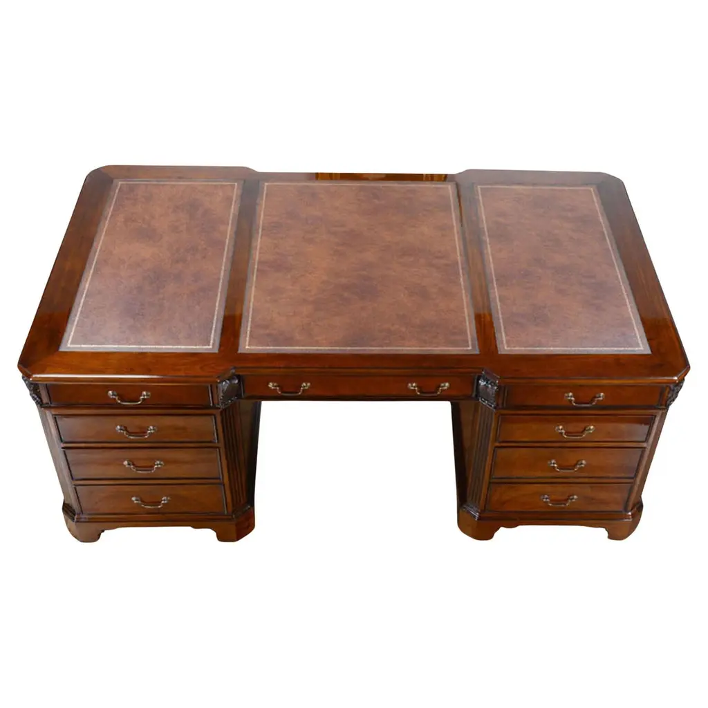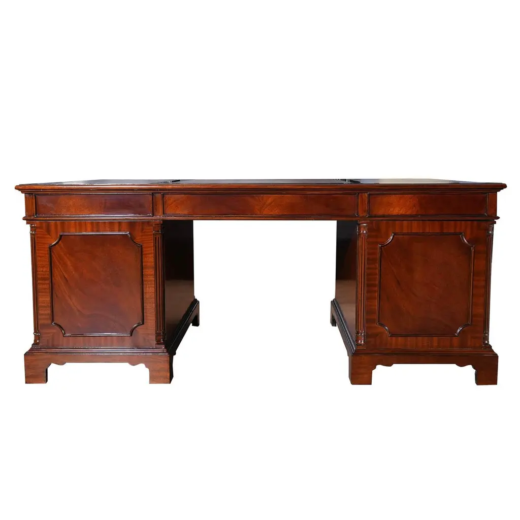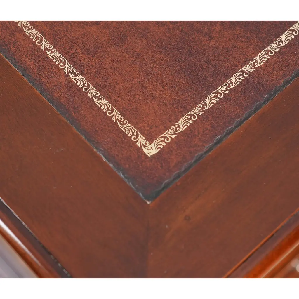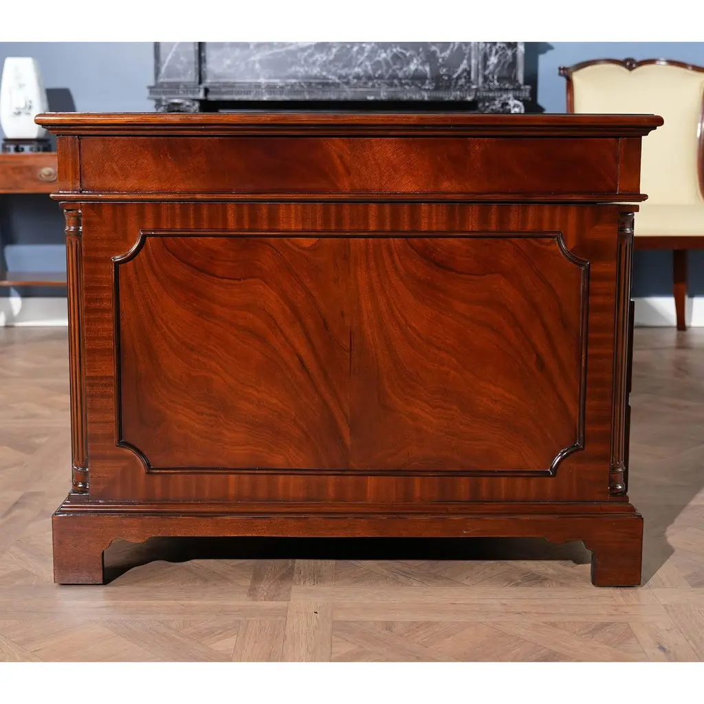 Equally suited for use either at the workplace or in a home office the Niagara Furniture Large Mahogany Executive Desk with tooled leather top is both decorative and functional. Built in three sections for easy handling and installation the top section has three deep drawers under a solid mahogany top frame inset with hand tooled genuine full grain leather of the finest quality. The left pedestal bank of the users side of the desk contains both a regular drawer as well two faux drawers which are supported on metal slides and is actually a hanging file drawer. The visitor side of the desk boasts great quality mahogany veneered panels separated from the rest of the panel by a molded wooden frame and all are supported and surrounded by reeded and turned quarter columns of solid mahogany. Closely related to many of our other Niagara Furniture Office items this Large Mahogany Executive Desk can either be purchased alone or with enough matching items to furnish an entire room.Kneehole is approximately 27.5 inches wide and 25 inches high.Desk Measures 72″w x 38″d x 30″h metric 183 97 76